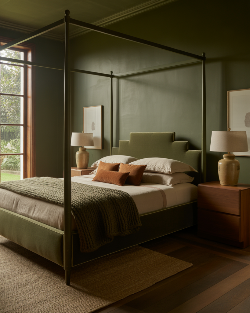 For a rich and mood-type feel, consider dark green tones in contrast to browns and neutrals. Imagine olive-colored bedspreads, walnut furniture, and clay-colored textiles. Nature means depth when dressed up in refined luxury. The grounding colors are the very best for any soul yearning toward weary sophistication but staying warm and organic alongside.