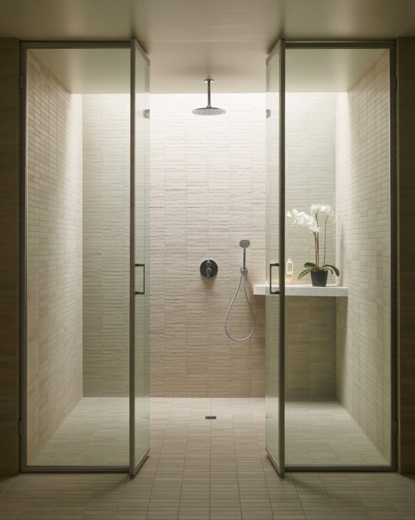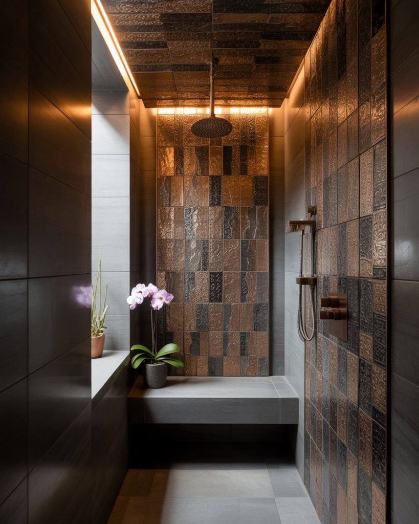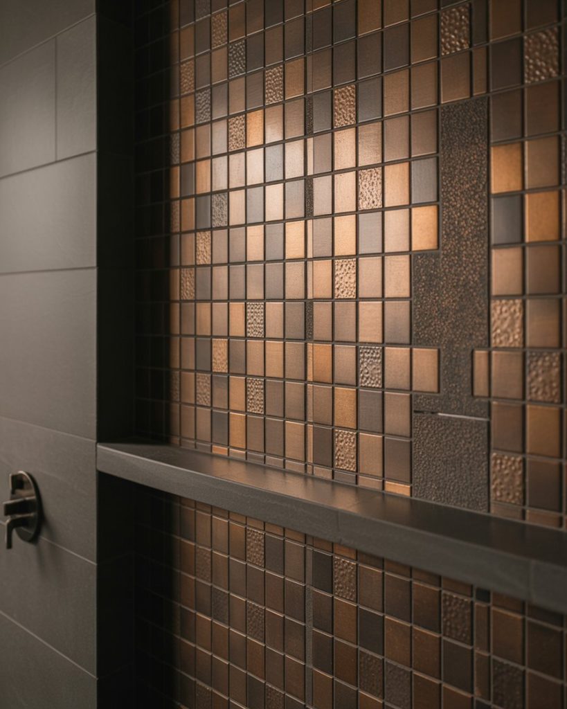 Metallics are stepping into showers as accent pieces, particularly in luxury homes. A few rows of brushed bronze or copper tile can add a dramatic sparkle against dark stone or neutral ceramics. Designers often use them vertically to emphasize height in a walk in shower. While best suited for a master bath, small touches can uplift a small bathroom with a glamorous edge.