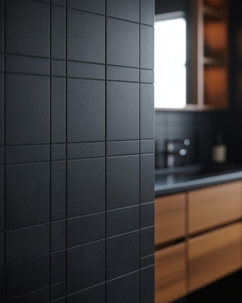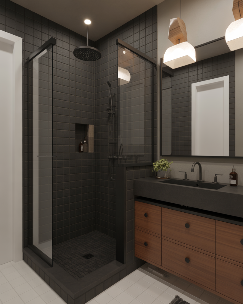 An all-black tiled shower may sound daring, but it creates an undeniably timeless and dramatic effect. Matte finishes prevent glare and keep the look grounded, while pairing with wood or neutral vanities softens the mood. This design works beautifully in modern lofts but can also elevate a small bathroom with unexpected depth.