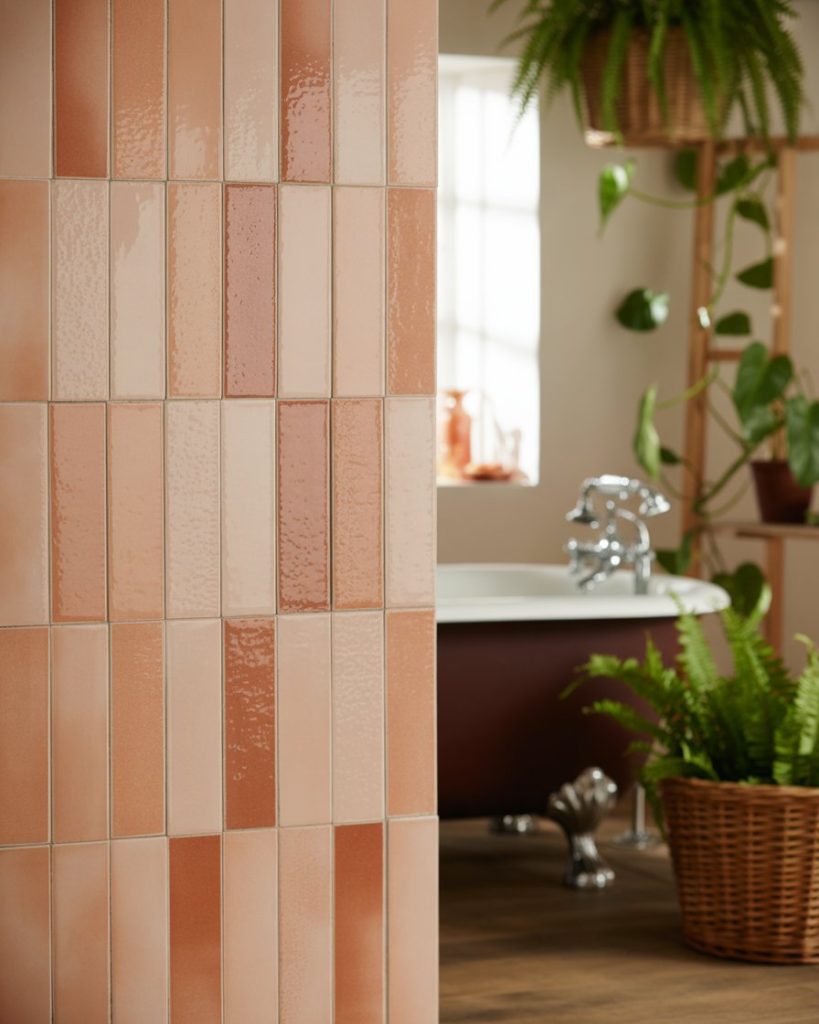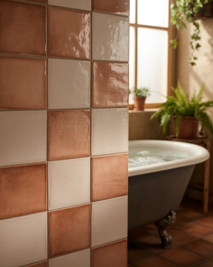 Clay-inspired tiles with terracotta hues bring Mediterranean charm into the bathroom. Their warm tone creates a cozy feel, pairing well with a rustic vanity or even a tub framed by greenery. Unlike shiny finishes, these matte clay tiles absorb light softly, making them ideal for a timeless bathroom that emphasizes natural materials. They also balance beautifully against white walls or black hardware.