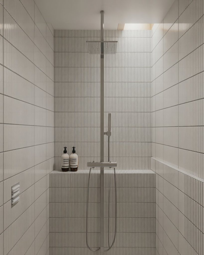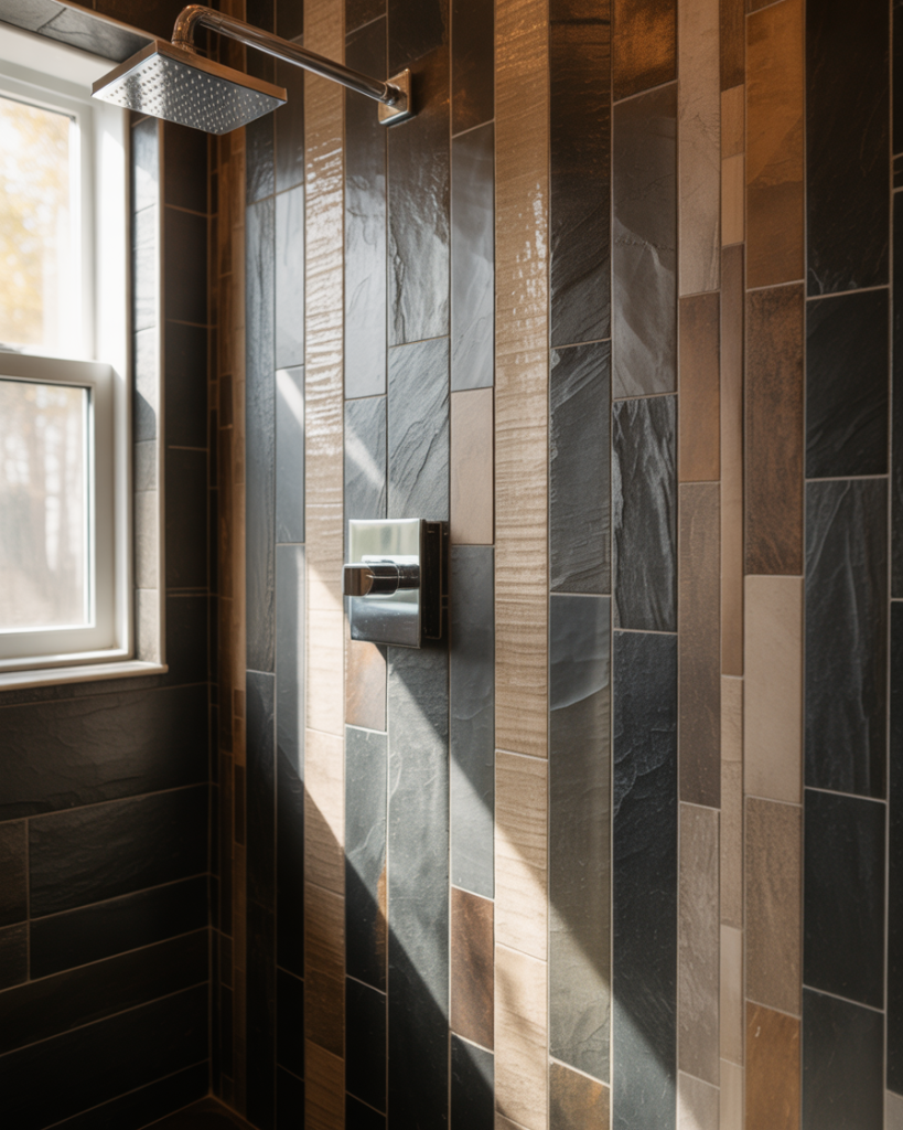 Vertical stripes in tile design are being used to visually elongate shower walls. Mixing neutral white slabs with thin black or blue strips gives a contemporary edge. This layout especially benefits small bathrooms, making ceilings look taller. For a master bath, wider striping in gray or stone adds luxury and balance, complementing a freestanding bathtub.