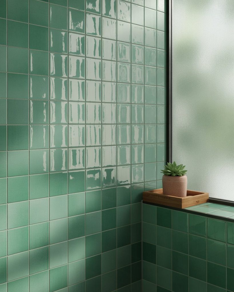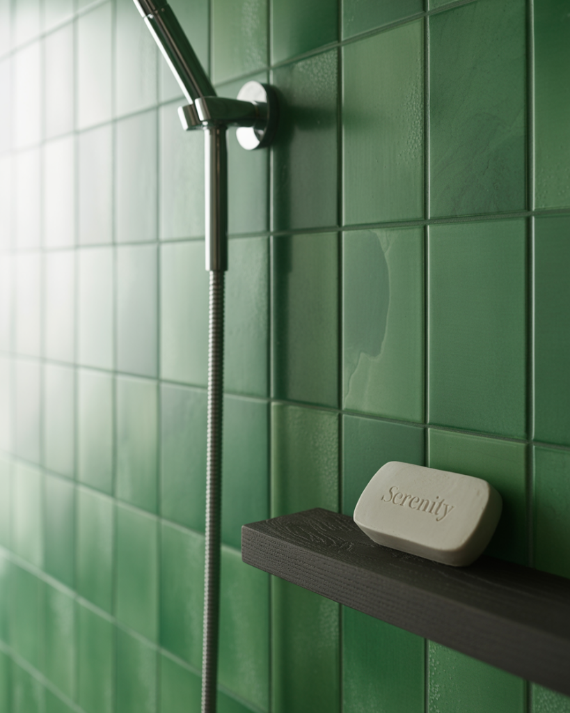 Soft green tiles are gaining attention for their calming, organic vibe. When combined with wood shelving or wood-look flooring, the effect feels both fresh and timeless. Green pairs beautifully with beige and white for a classic spa-inspired shower. Designers note that this palette feels particularly soothing around a tub or in a master suite intended for relaxation.