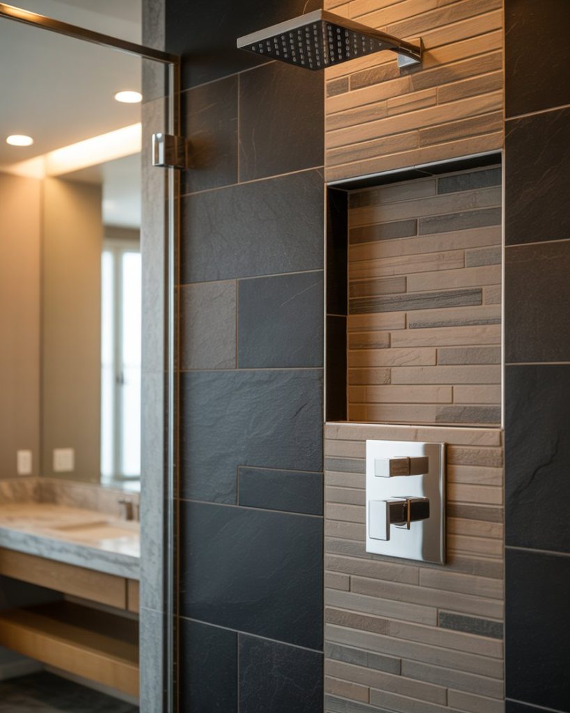 Mixing materials—like black slate with wood-look planks, or white marble with beige stone—creates layered depth. This approach is ideal for larger master showers where contrasts can shine. It brings a timeless yet contemporary twist by combining old and new, smooth and textured. Even a small bathroom can benefit if just one accent wall features the mix.