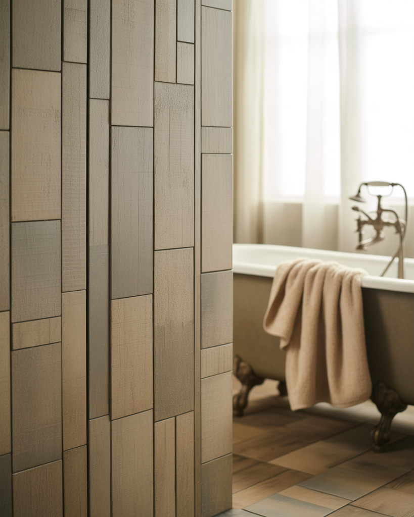 Wood-look tiles remain one of the most beloved trends for 2026, especially in rustic and farmhouse-inspired interiors. They capture the cozy warmth of timber but are far more low-maintenance in wet areas. Vertical plank layouts add height to a shower, while horizontal ones create cabin-like charm, perfect next to a tub or bathtub.