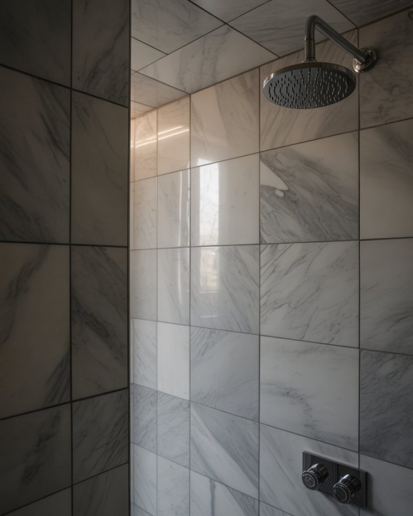The move toward large shower tiles reflects a desire for simplicity and elegance. With fewer grout lines, slabs in gray or stone finishes give a luxury spa feel while keeping the look low-maintenance. A walk in shower wrapped in oversized tile creates clean lines and a calming, expansive atmosphere—ideal for those who want an uncluttered space.