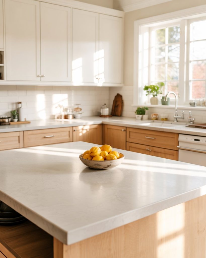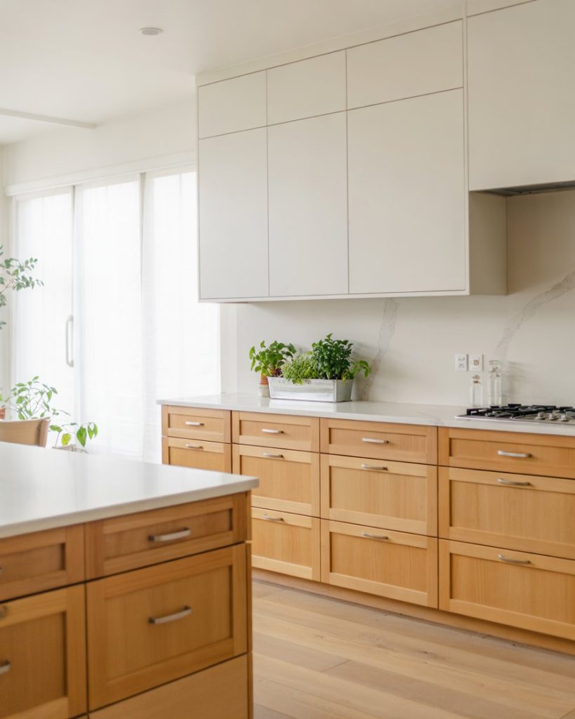 1. Soft White with Light Wood Lower Cabinets