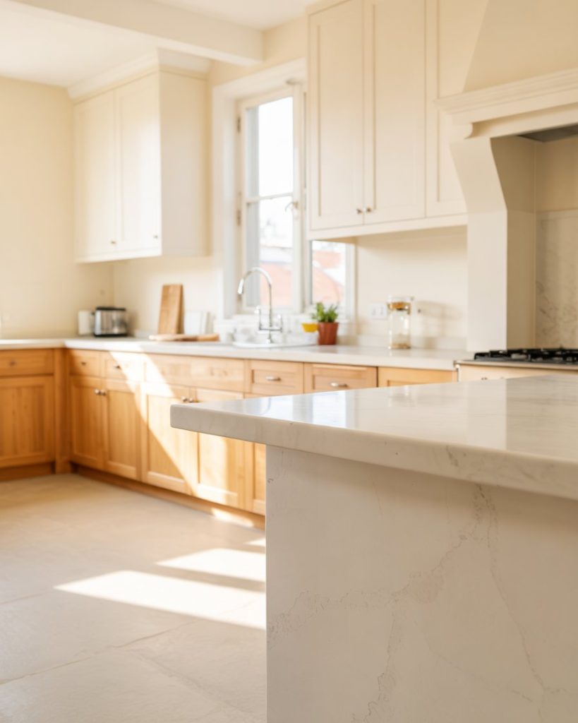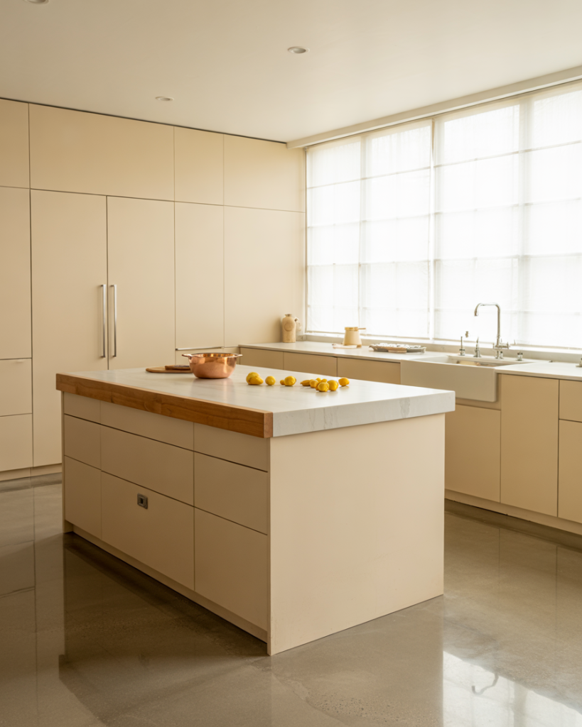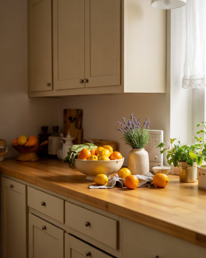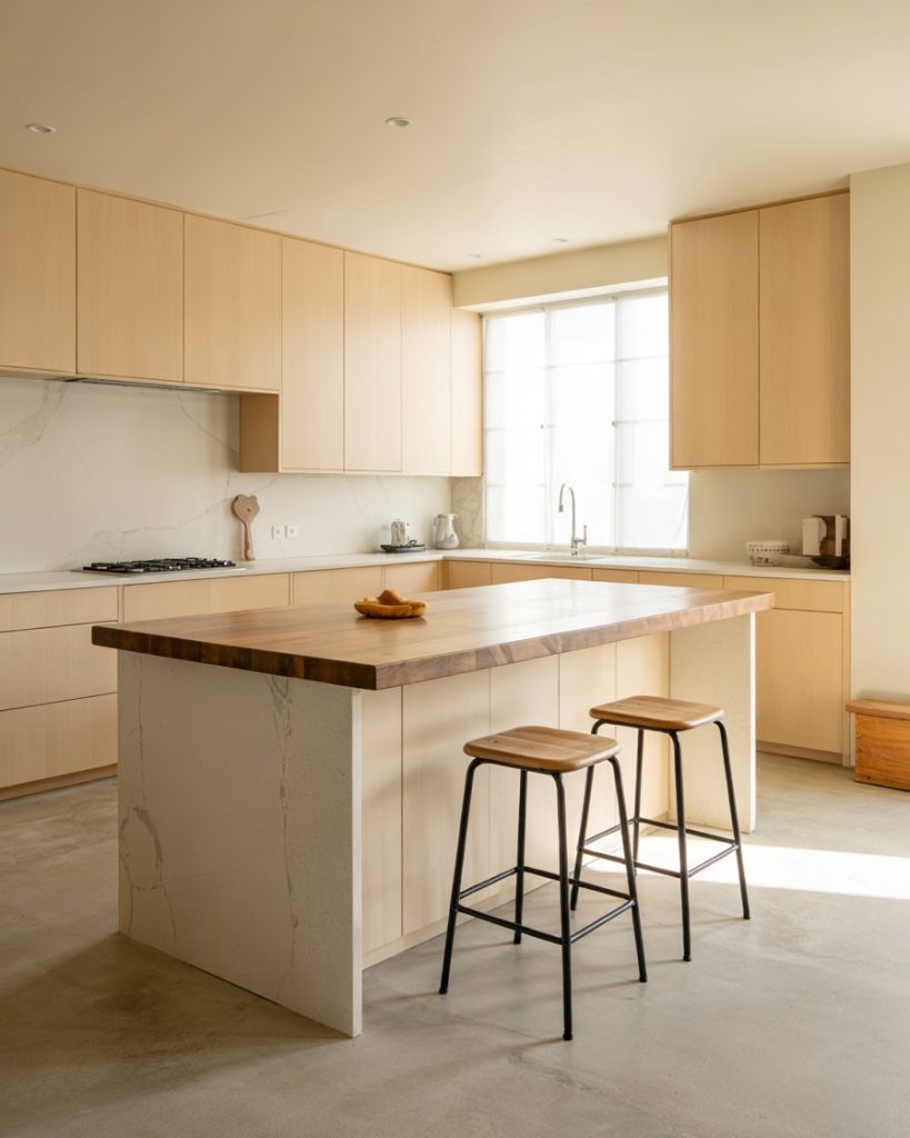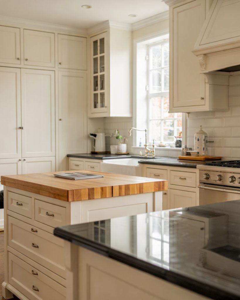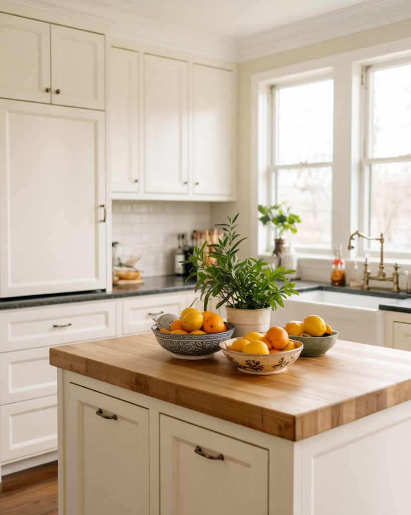 This subtle 2-tone pairing merges the brightness of off-white with the cozy neutrality of taupe. It’s especially fitting for small spaces or open floor plans, creating a cohesive transition between kitchen and living areas. When layered with butcher block counters, the result feels inviting and timeless.