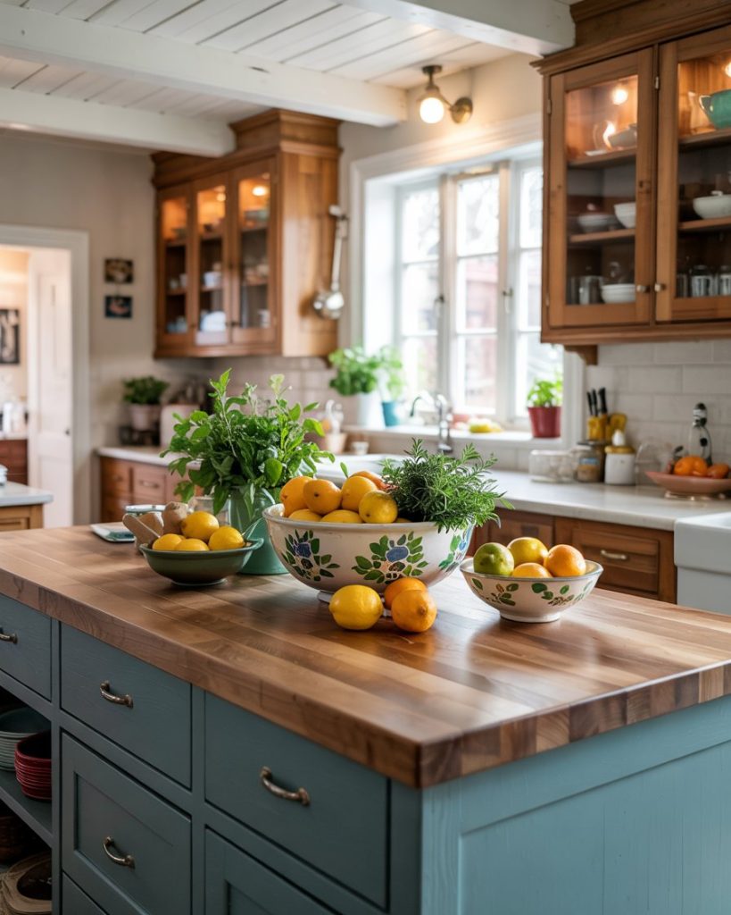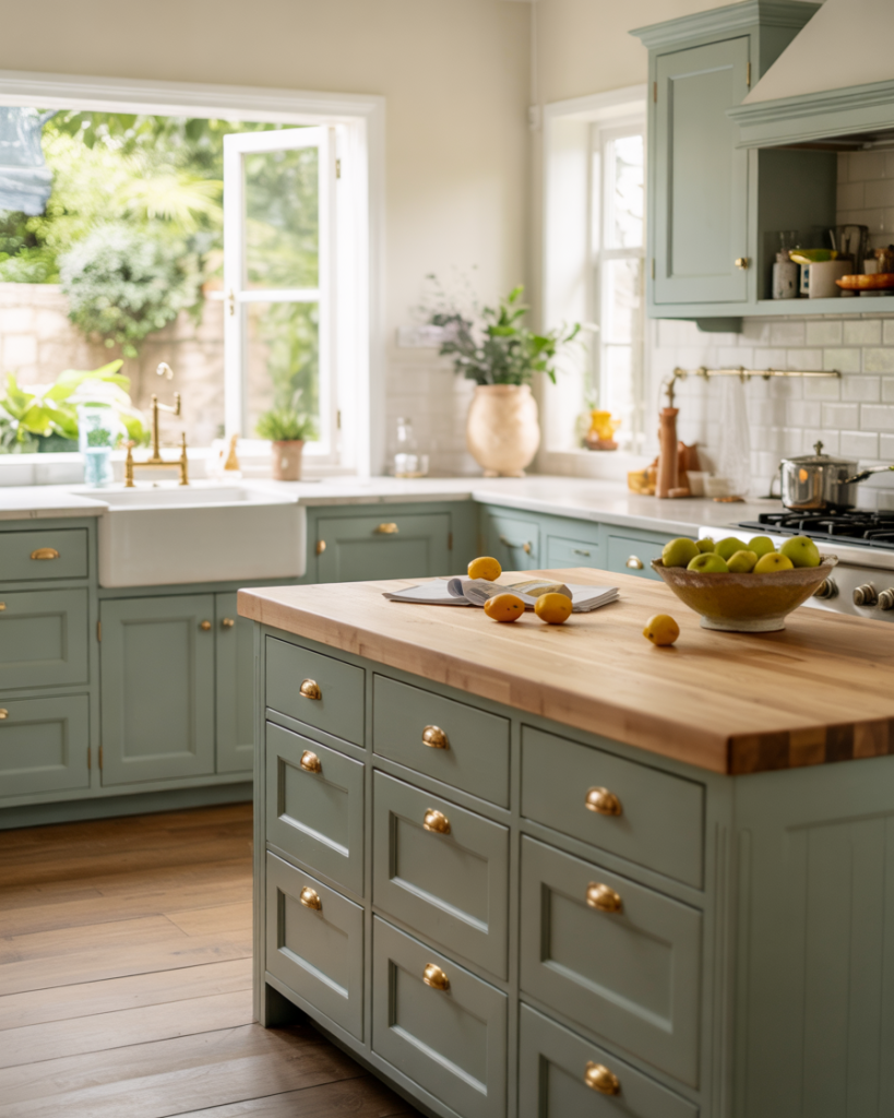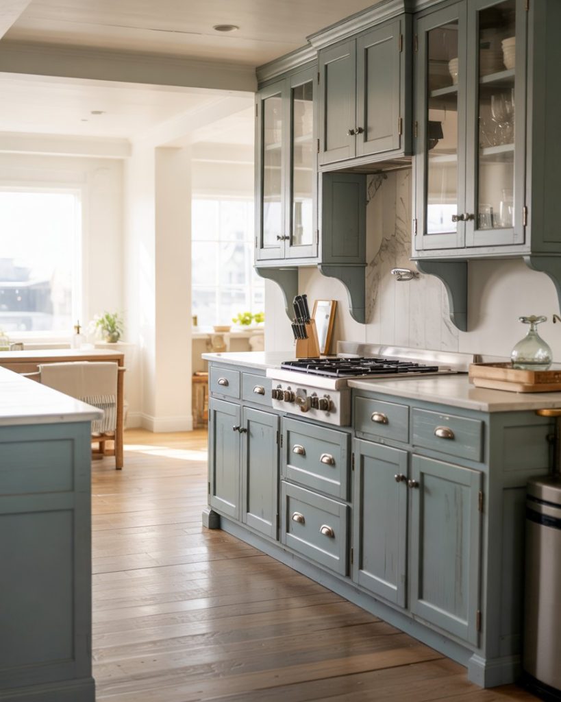 The final trend heading into 2026 is the soft blue-green palette. A muted teal cabinet tone feels refreshing without being loud, offering color depth that blends perfectly with wood floors and butcher block counters. It’s a balance of modern color and organic material—perfect for homeowners who want their kitchen to feel fresh yet lived-in.