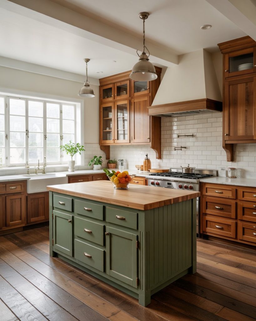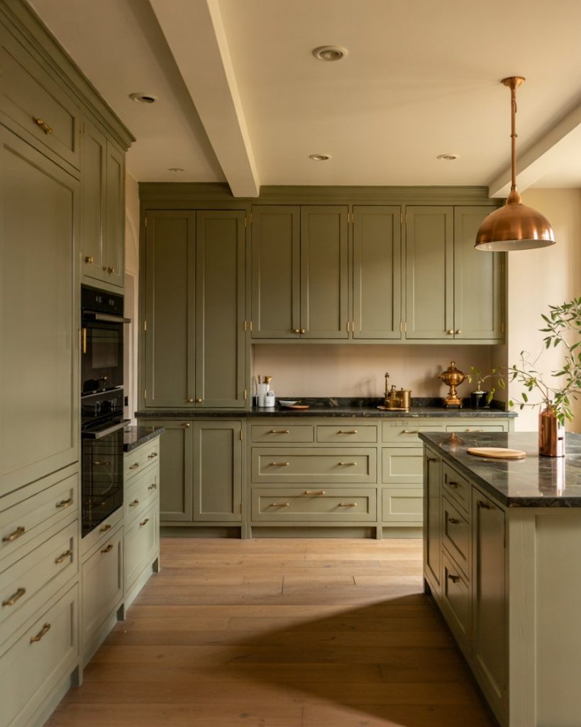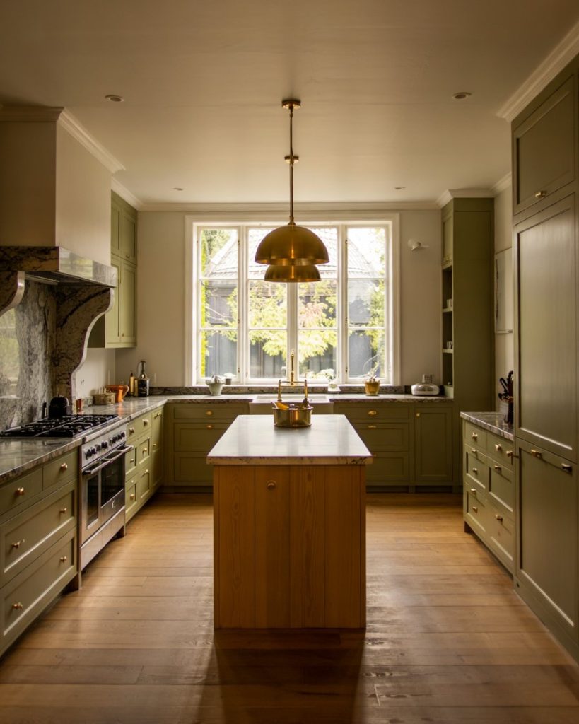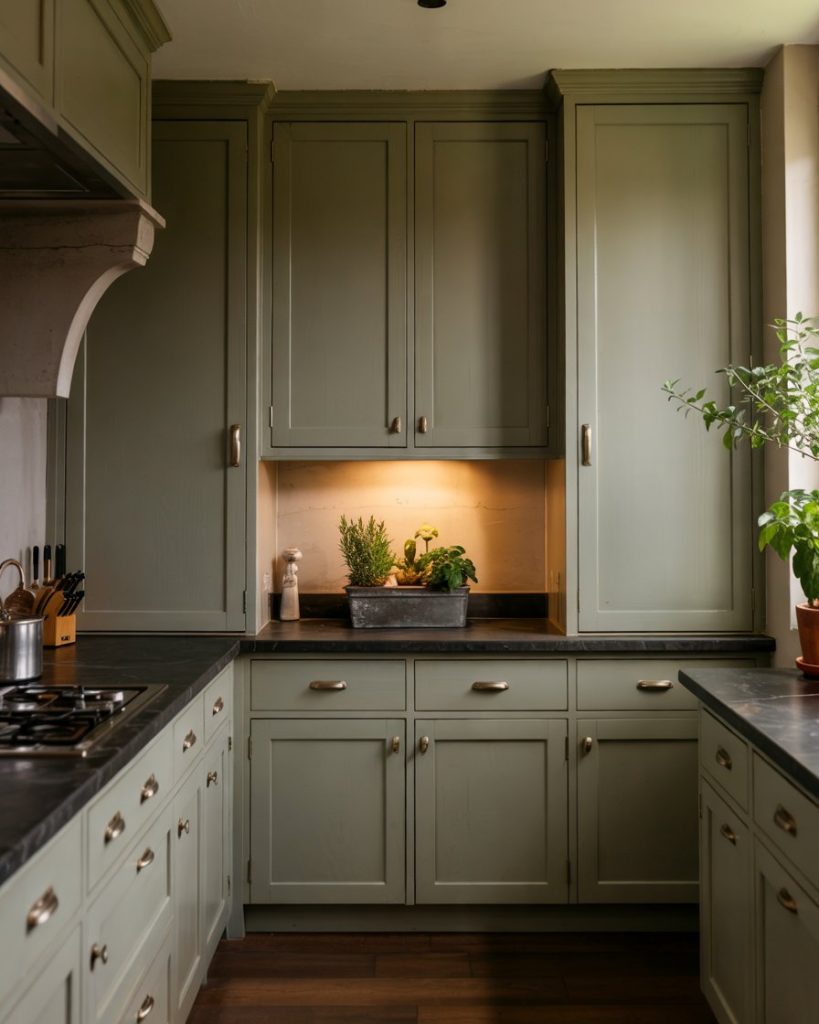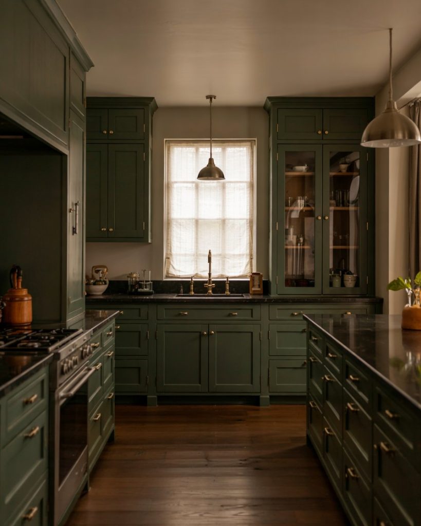 A subtle green shade like olive adds refined character to any kitchen. This painted hue pairs beautifully with dark granite counters and brass hardware, creating a warm yet grounded atmosphere. Olive works especially well with a wood floor or dark brown floor, balancing earthy sophistication with understated elegance.