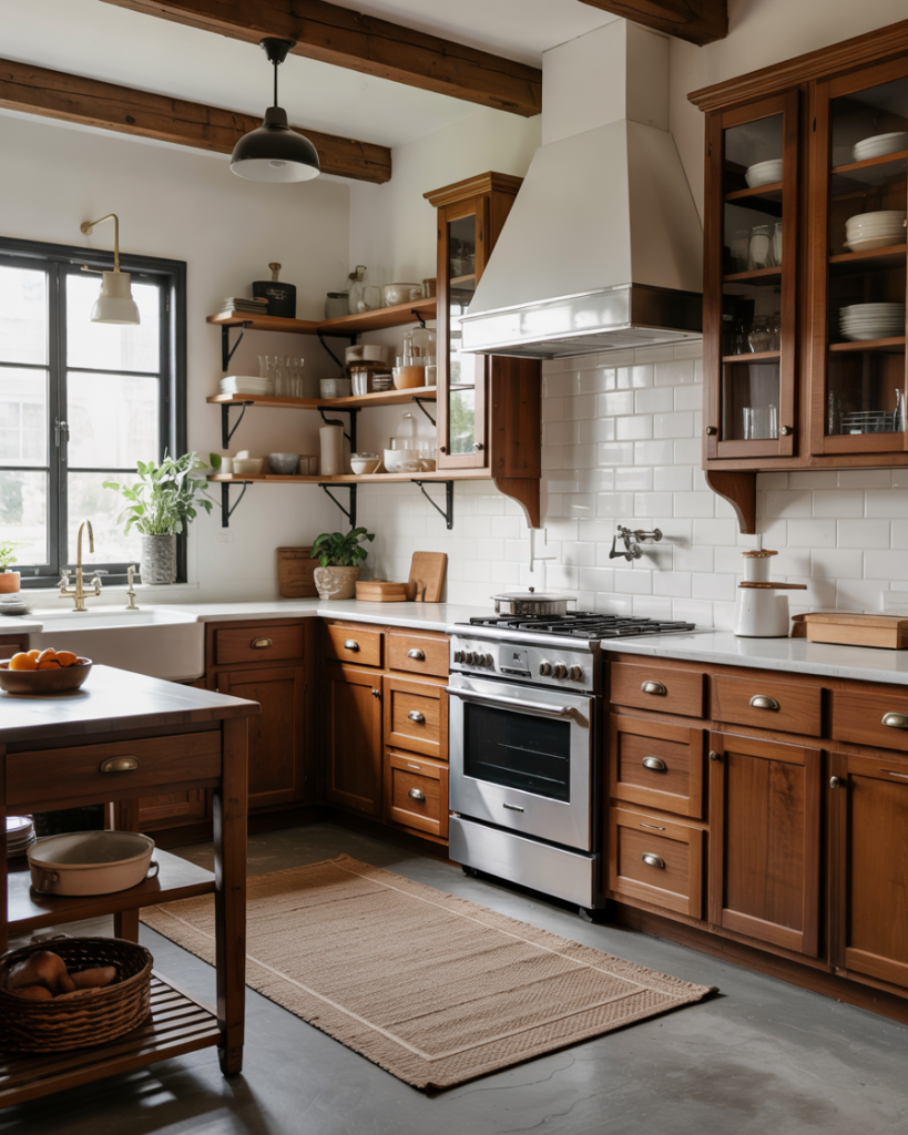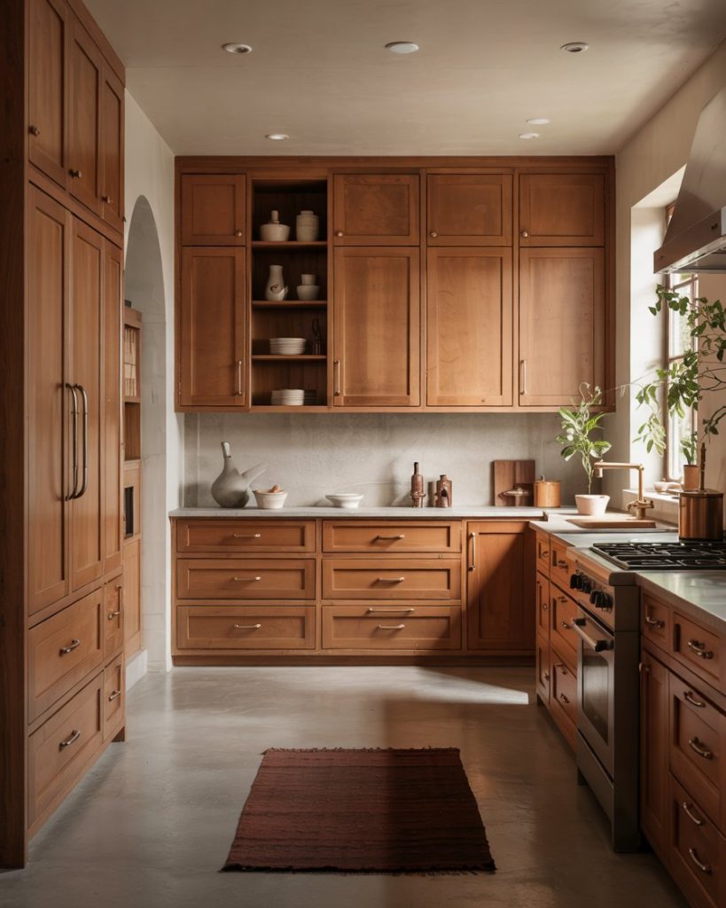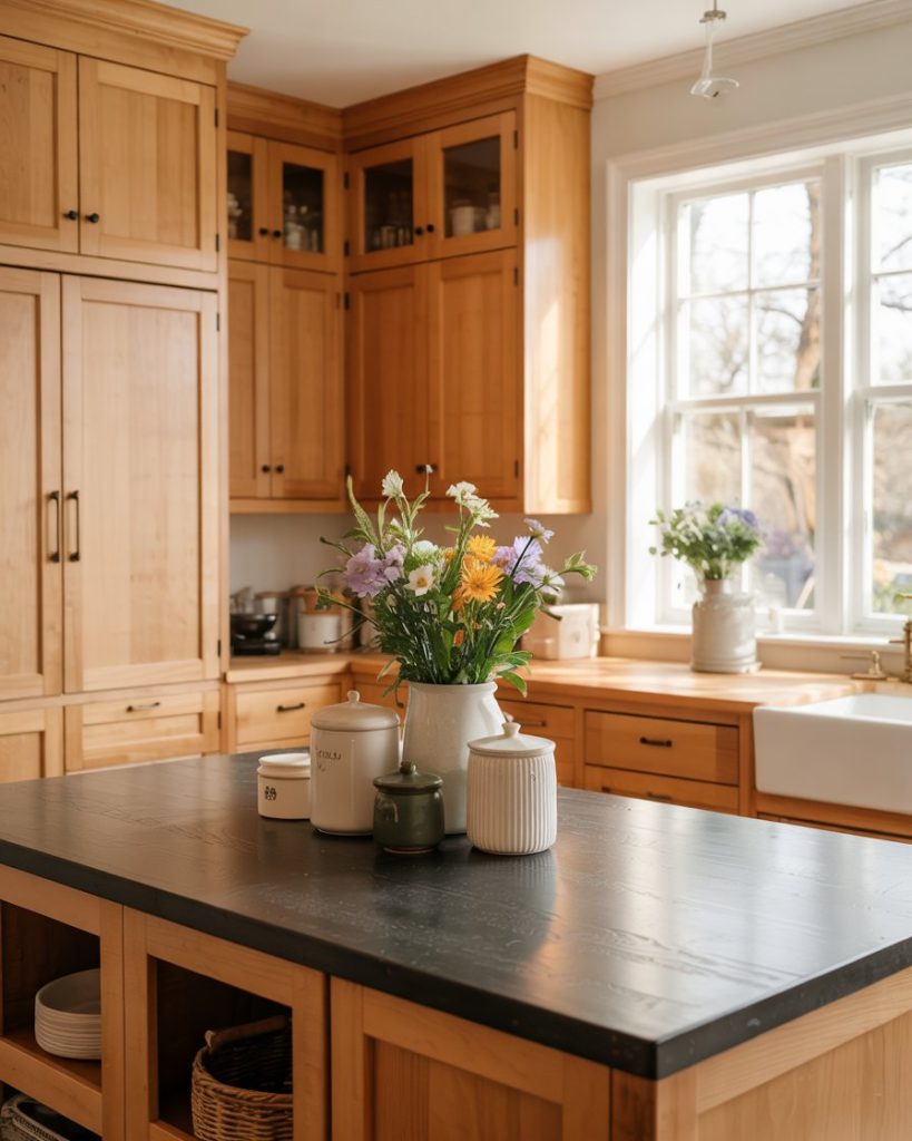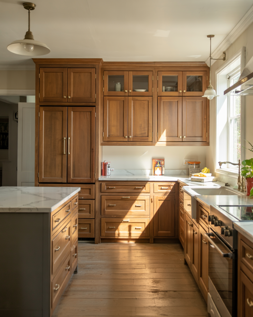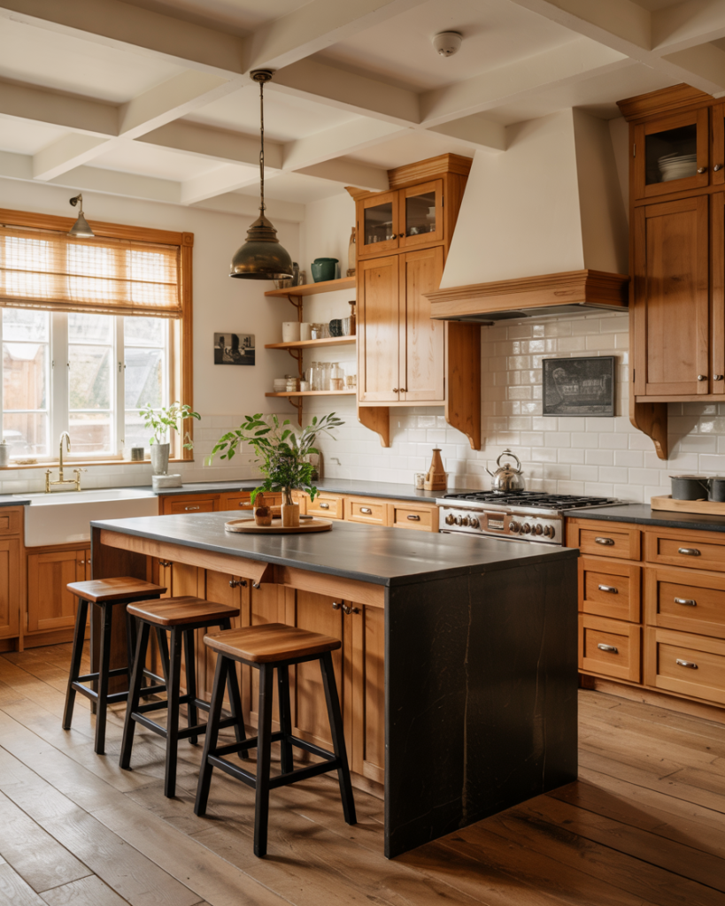 Honey-stained wood cabinets bring back the cozy glow of early 2000s kitchens—but with a 2026 refresh. Paired with painted trim in creamy white or gray, they create warmth and balance. This style complements dark countertopsor even black slab islands, grounding the kitchen with organic beauty.