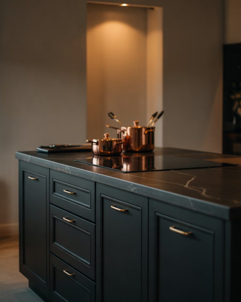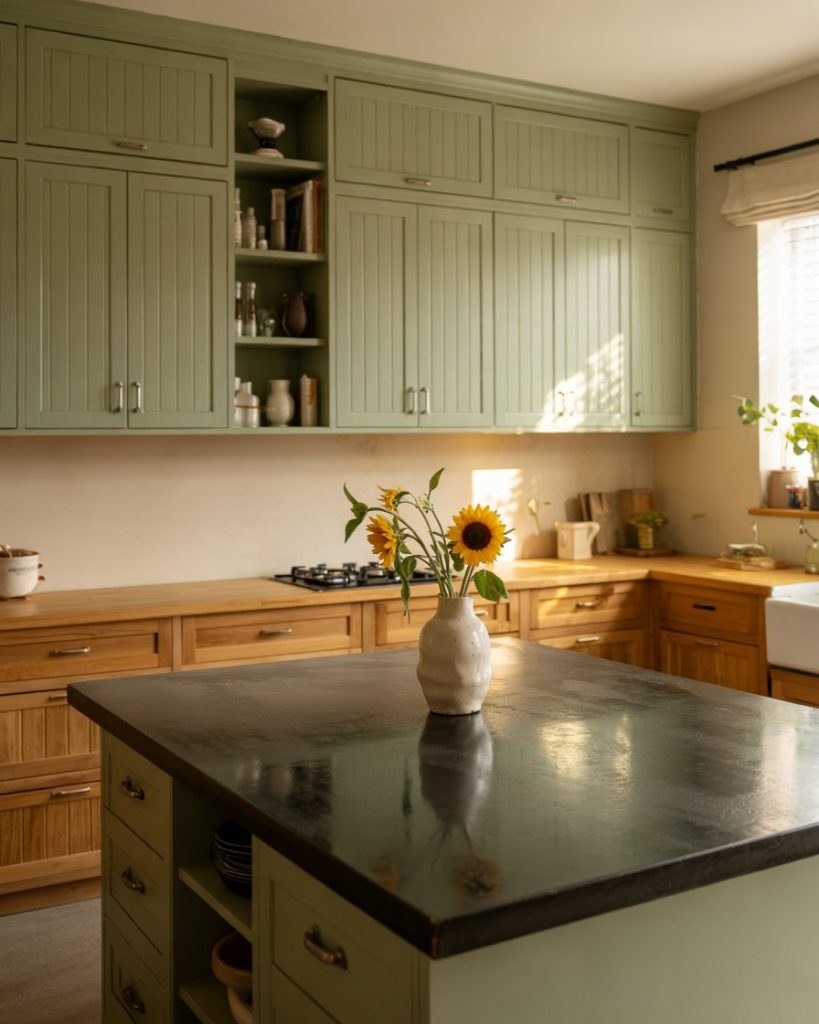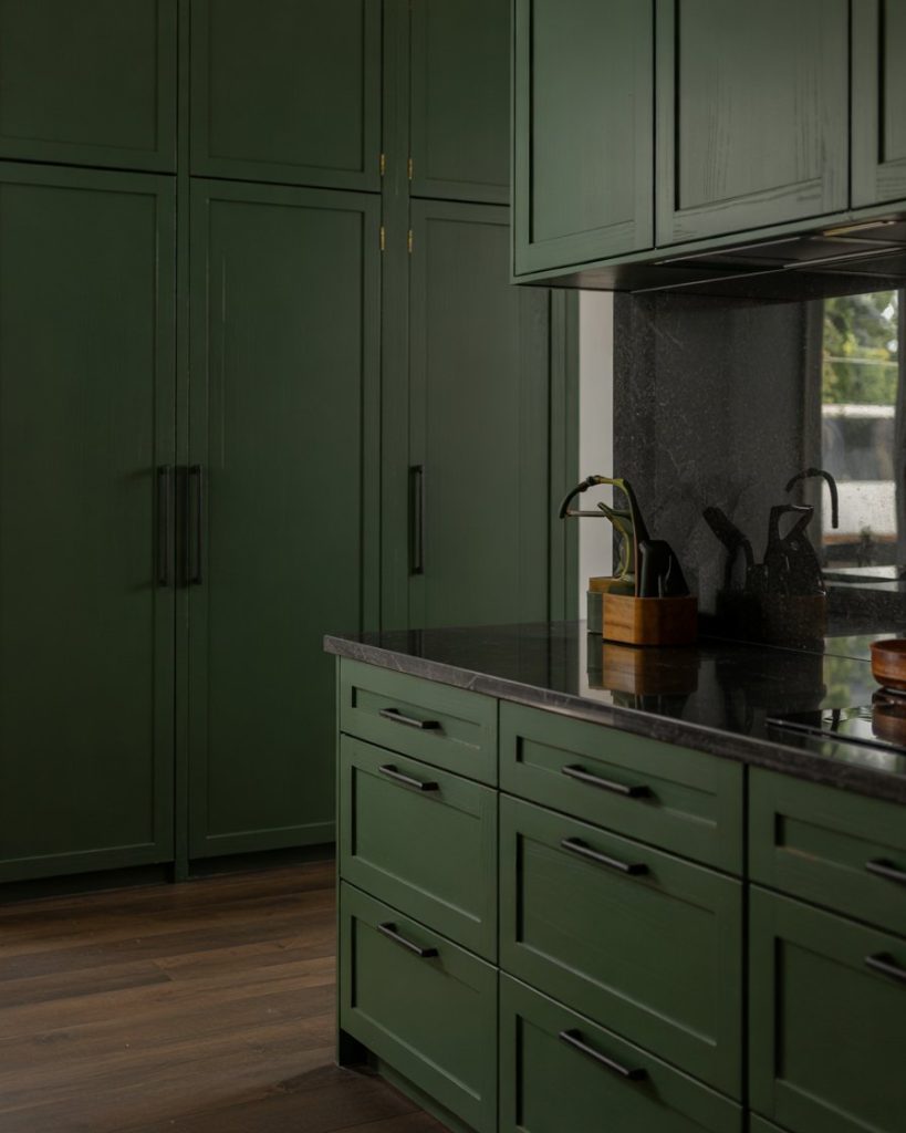 A deep green cabinet color paired with black granite counters or black slabs instantly creates a rich, moody ambiance. Perfect for large kitchens or those with plenty of light, this bold pairing feels luxurious. Add a dark brown floor or wood floor for warmth and texture contrast.