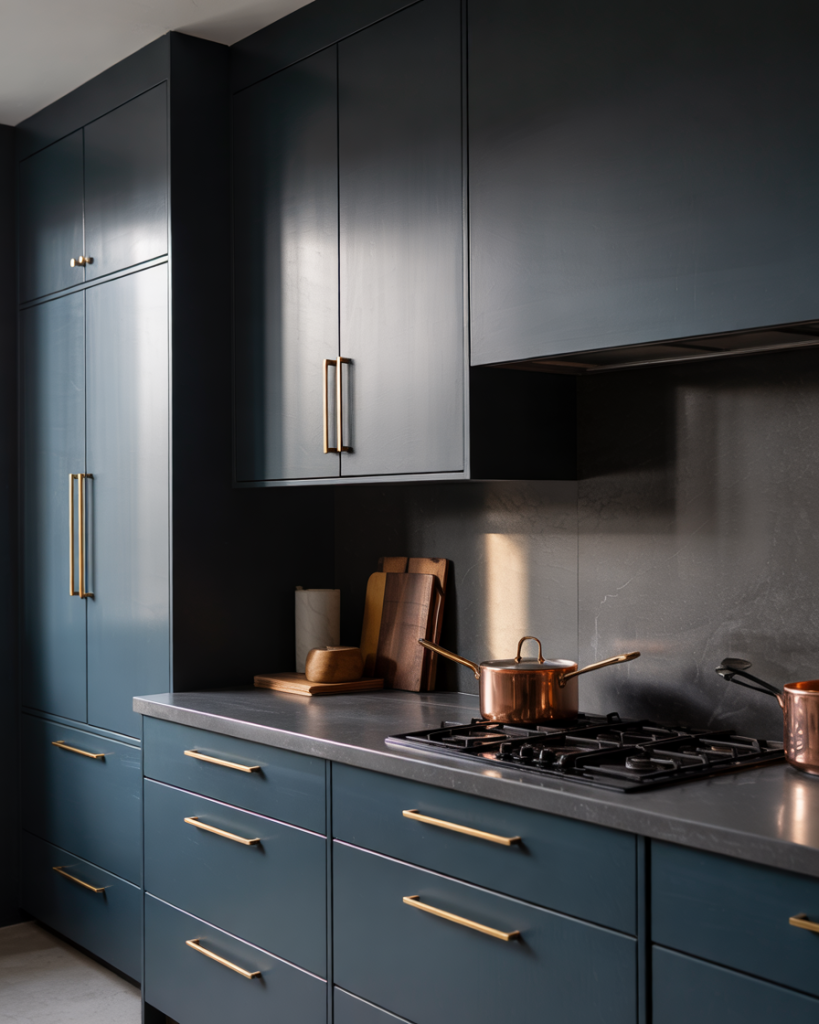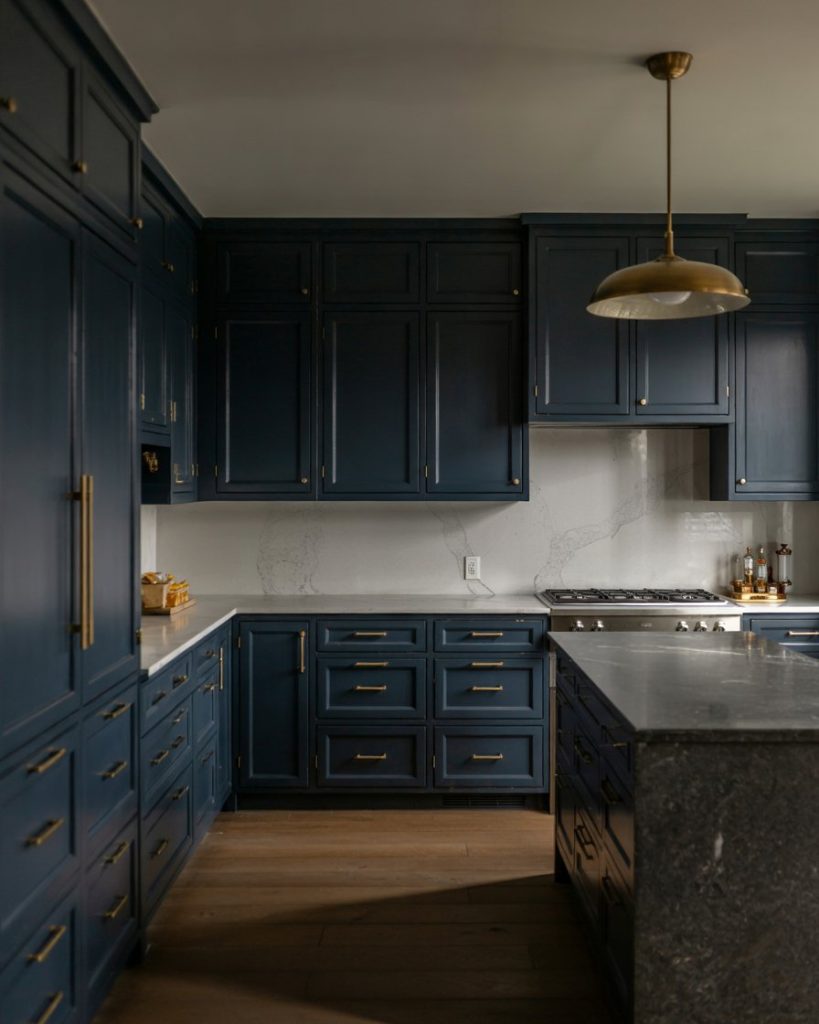 A deep blue or navy kitchen offers a moody yet refined aesthetic. When paired with dark granite counters or black slab surfaces, it creates drama; combine it with a whiteand metallic accents for a sophisticated balance. Designers predict navy’s longevity because it feels bold but still timeless, especially in spaces with ample natural light.