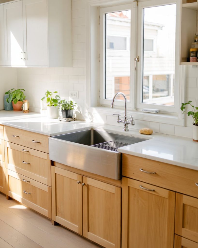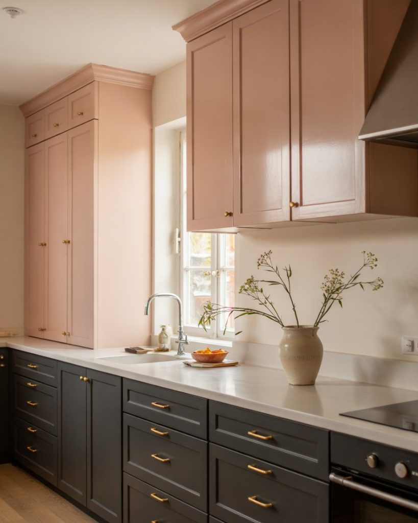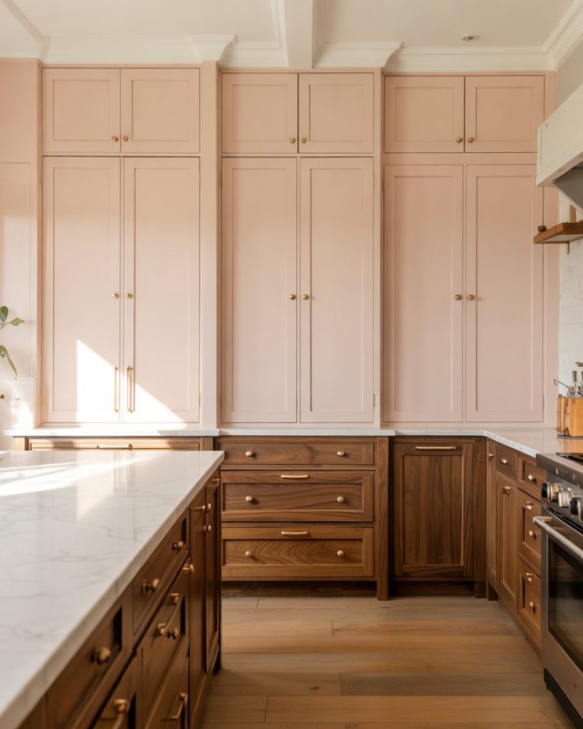 For those who love color but prefer subtlety, blush pink or pale pastel uppers paired with darker lowers make a striking 2-tone combination. The gentle hue softens the kitchen, while darker bases add definition. Pair this with a wood floor and white countertopto keep it light and approachable, perfect for personal yet chic spaces.