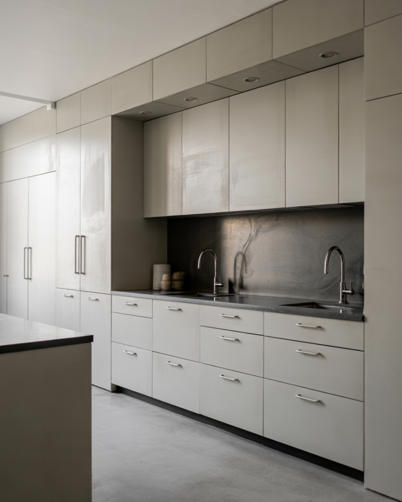 For industrial-inspired homes, painted cabinets in concrete gray are sleek and modern. They harmonize perfectly with concrete floors, dark countertops, and stainless fixtures. This palette is neutral yet edgy, ideal for loft kitchens or minimalist designs that value texture over color.