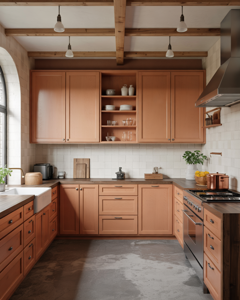 Warm terracotta tones are emerging in 2026 paint palettes for their connection to nature and comfort. This color radiates a sun-baked charm that pairs beautifully with concrete floors or a dark brown floor, bringing an organic, lived-in vibe to any kitchen. Terracotta complements both light and dark counters, enhancing texture and warmth across styles.