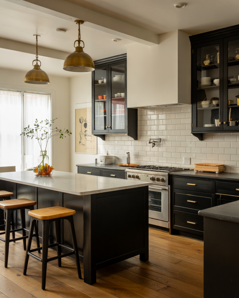 Black cabinetry is bold but endlessly timeless. A kitchen with black slab or black granite counters makes a striking statement, particularly when balanced by a white countertopon the island or backsplash. In a small space, use semi-gloss paint to reflect light, while larger kitchens can handle matte black for a sleek, dramatic effect.