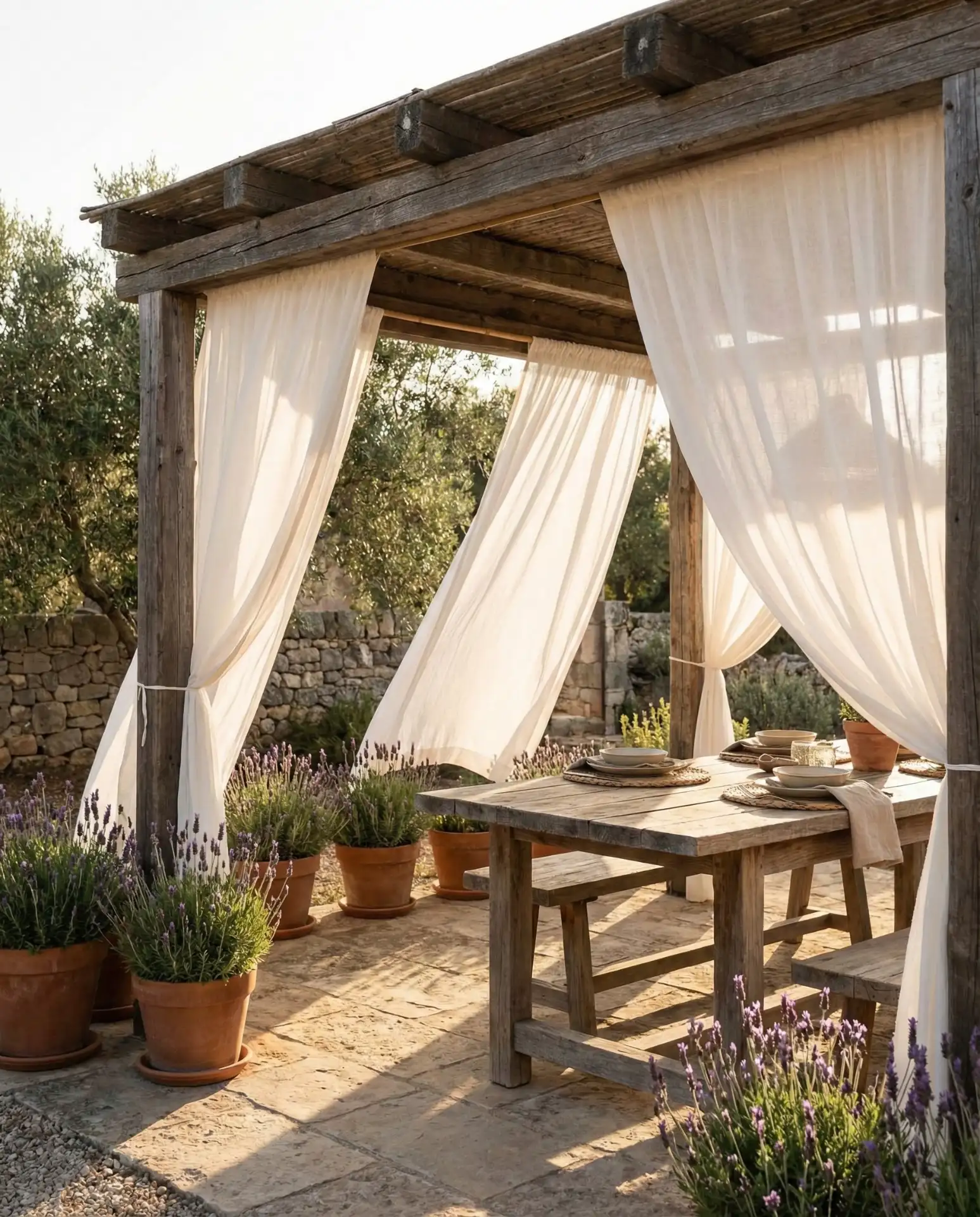 A white Mediterranean-inspired gazebo with arches and terracotta accents creates a breezy coastal vibe. It works beautifully in sunny climates and pairs well with tiled flooring or clay pots. You would feel instantaneously be on a seaside villa if it is placed in your backyard. It’s a chic option for design lovers who want to elevate their outdoor space.