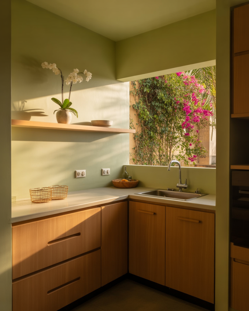 Nestled into the edge of a small apartment, a corner kitchen layout maximizes every inch without compromising openness. Put up floating shelves, select light wood and use soft paint colors for a cool look. It works really well in Kerala-inspired homes that don’t have much space.