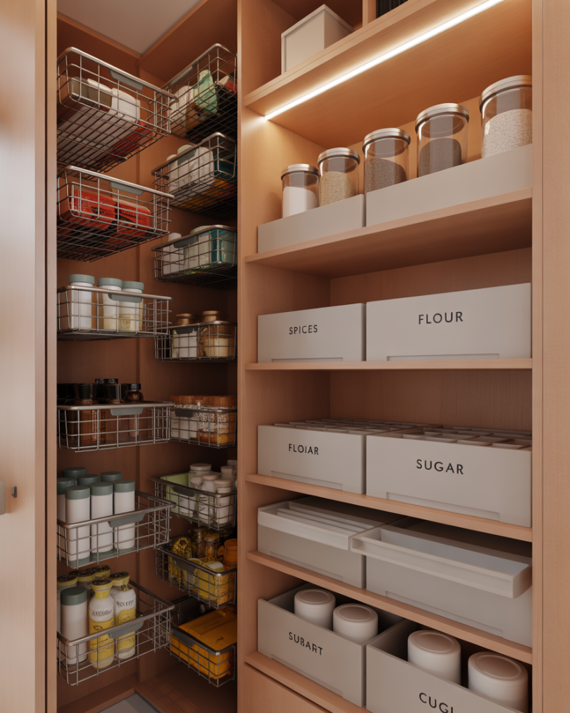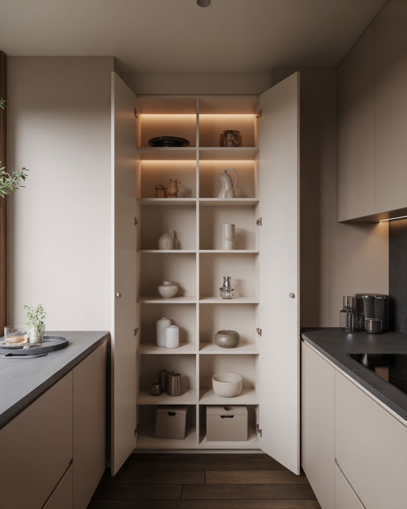 In 2025, we design larger kitchens without clutter. A large pantry benefits from clearly defined organization ideas: dry goods, canned goods, snacks, and overflow appliances all have their place. Add drawer dividers, tiered shelving and clear storage bins so you can see everything at a glance. Integrate your pantry into your kitchen décor by installing a frosted glass or barn-style door.