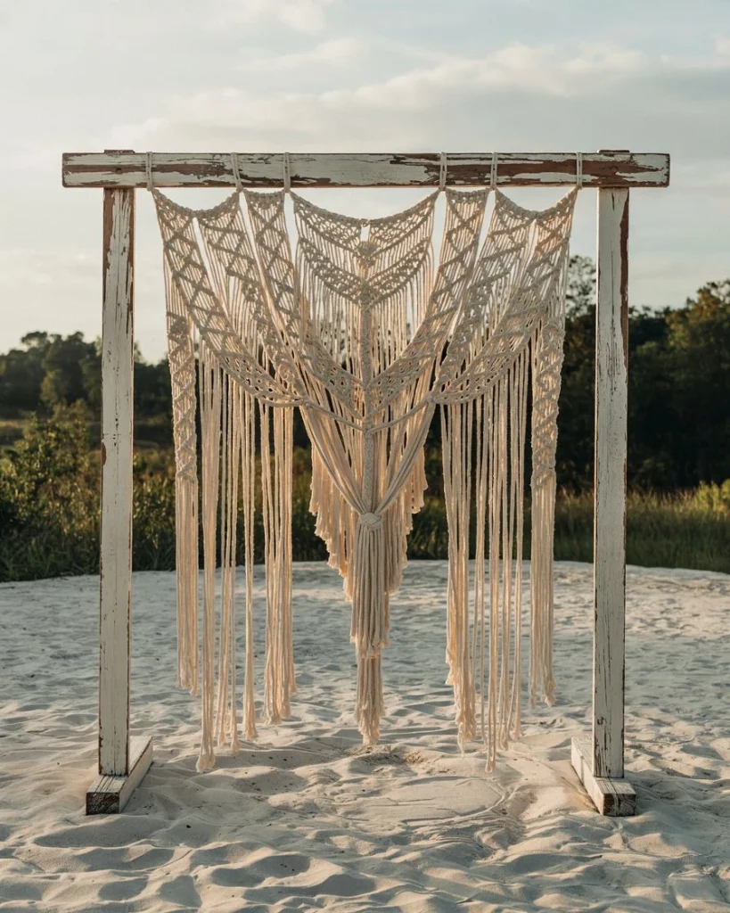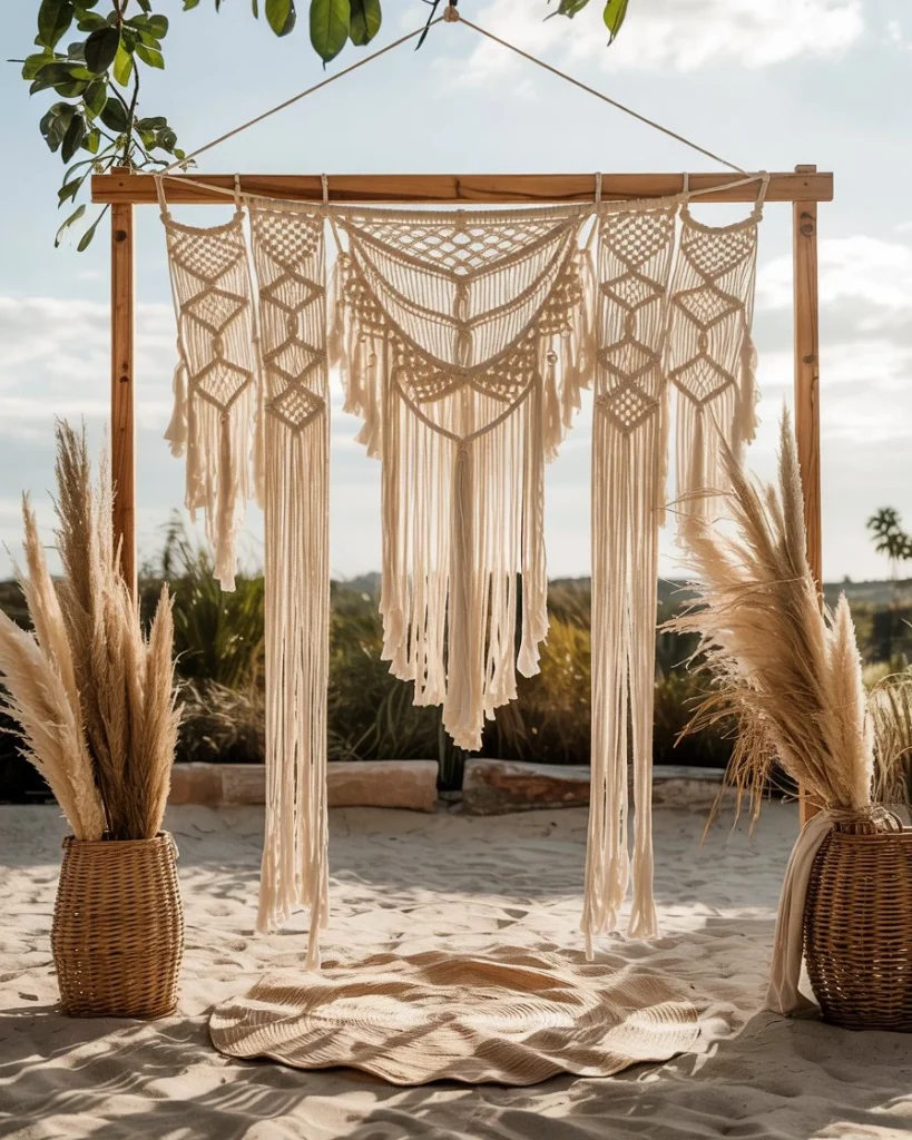 A large macramé panel or series of woven wall hangings creates a textured, bohemian backdrop for the ceremony. The neutral tones of cotton rope work with nearly any color palette and add visual interest without competing with the couple. This style suits beach weddings, desert ceremonies, or garden settings where you want something more unique than a traditional arch. The macramé can be handmade or purchased from artisans online.