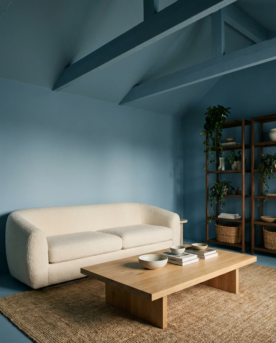 One of the most talked-about living room trends right now is painting not just the walls but extending color up onto the ceiling as well—creating an immersive, enveloping effect that feels genuinely architectural. In blue, this technique is especially effective: a mid-tone dusty blue that wraps walls and ceiling creates a sky-like canopy that makes any furniture placed below it feel significant and intentional. It’s a designer trick that completely changes the spatial experience of a room without touching a single piece of furniture.