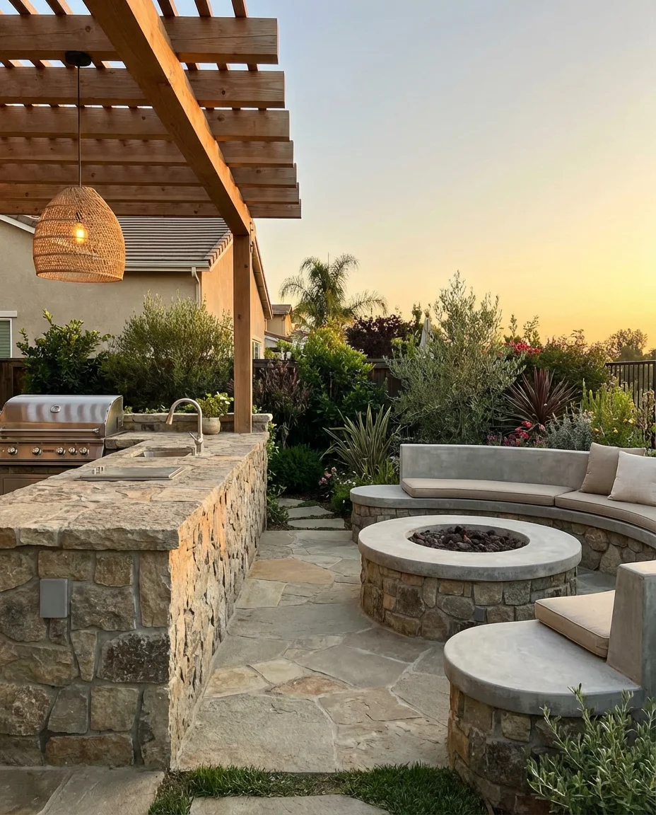 20. Backyard Fire Pit with Outdoor Kitchen Integration