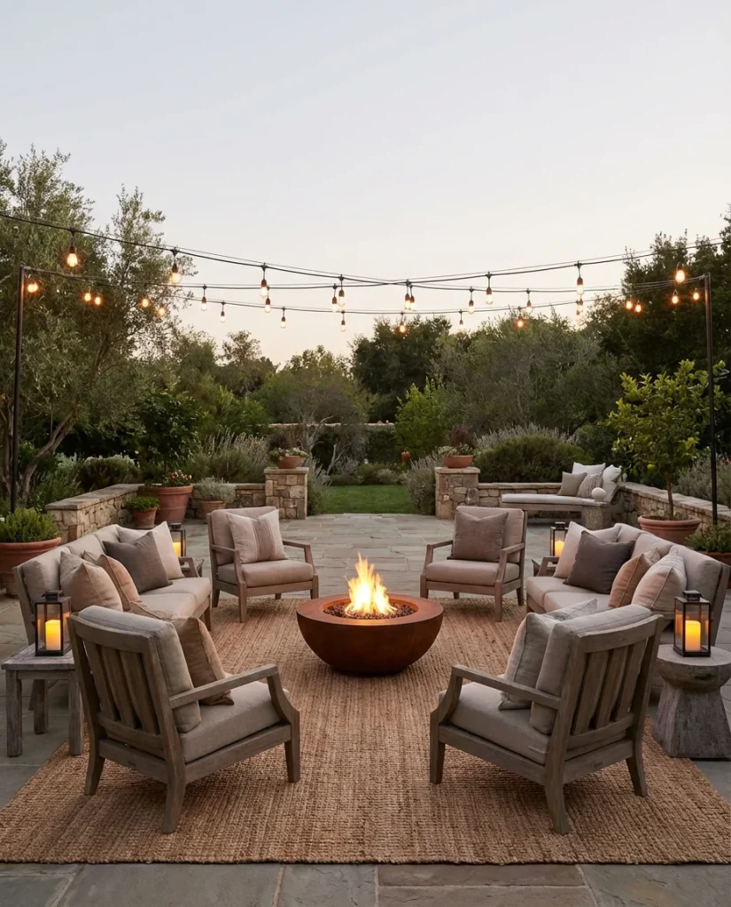 This is the idea most often pinned on Pinterest for a reason—it’s visually complete and immediately achievable without construction or significant budget. A quality outdoor rug in a bold geometric or natural stripe pattern runs $80 to $180 at most home goods retailers. Add throw pillows in complementary colors, a few lanterns with battery-operated candles, and a strand of warm Edison lights above, and the whole space can be transformed in a single afternoon for under $300. It’s the easiest and highest-impact way to finish a fire pit area, and it works equally well whether your pit cost $50 or $5,000.