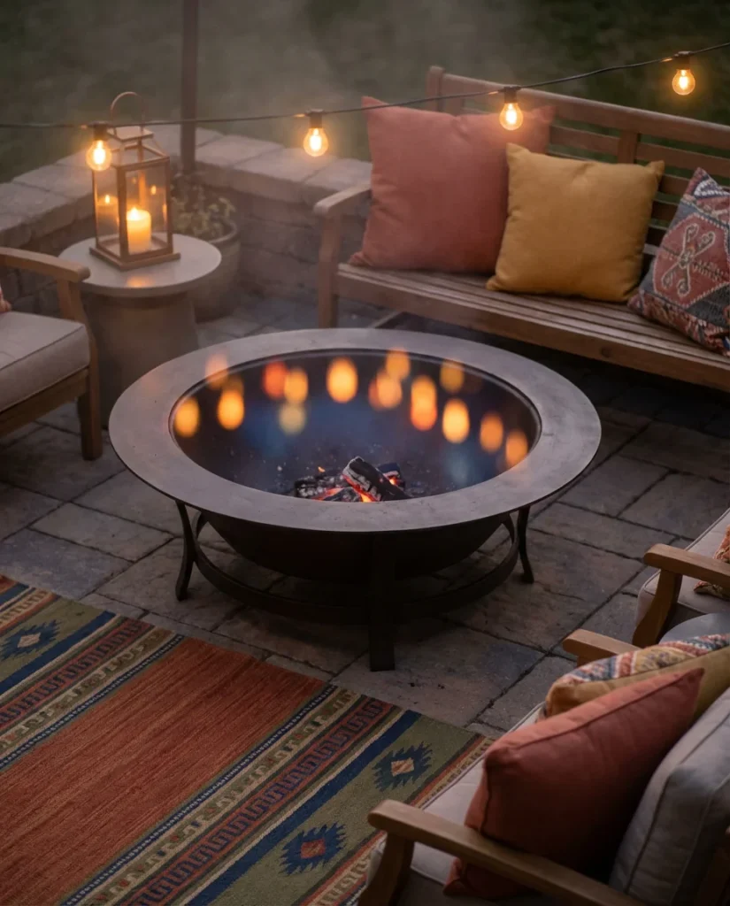 The finishing touches that turn a fire pit area into a true outdoor room: an oversized weather-resistant rug under the seating, with lights strung overhead, and a mix of throw pillows and lanterns placed throughout. These are the layers that make a backyard feel styled rather than assembled. The rug defines the space like a living room rug does indoors—it draws a boundary, adds color, and makes everything within it feel intentional. Pair it with string lights above, and the transformation from yard to room is complete.