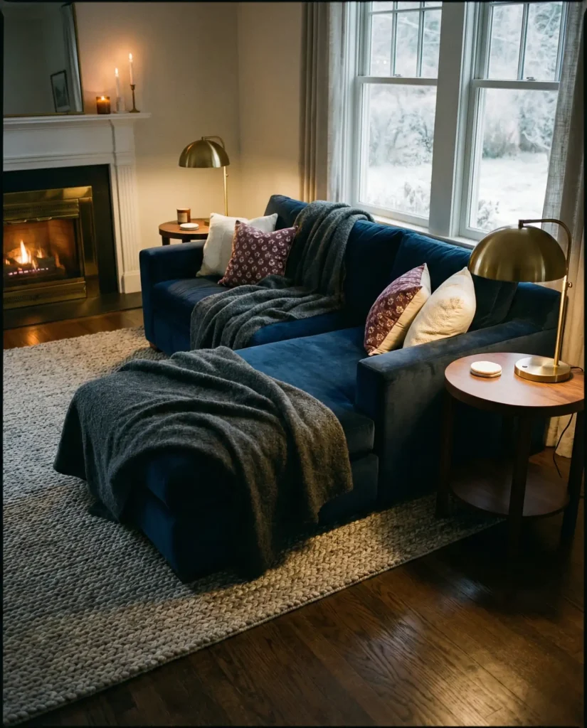 When the days get short and the temperature drops, there is nothing quite like retreating into a living room that feels deliberately cozy and warm. A blue sectional in a deep, saturated shade paired with charcoal throws and dark wood accents creates exactly that kind of cocoon. This is a room that practically invites you to curl up—the colors are rich enough to feel luxurious, but the softness of the fabrics keeps it from feeling cold or austere.
