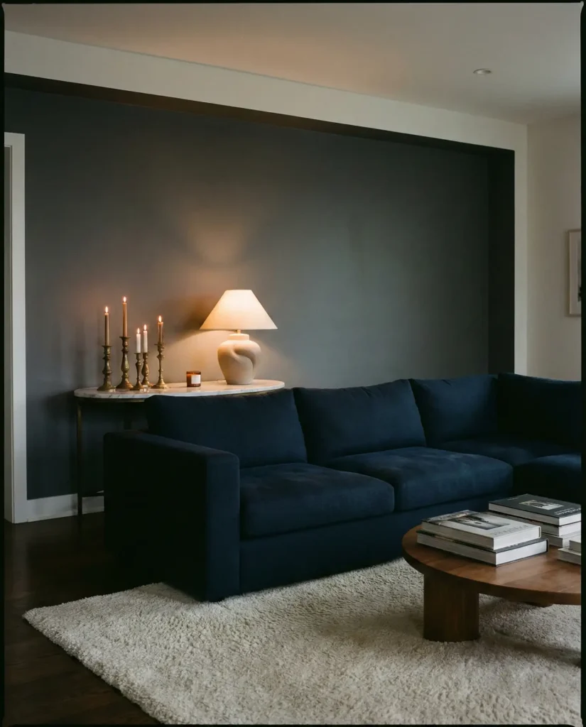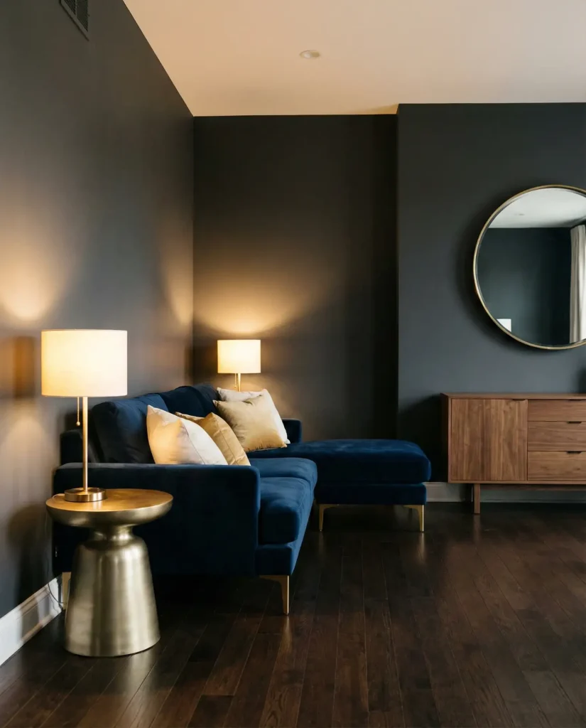 If you entertain often or simply love the idea of a living room that feels like a proper grown-up space, a navy sectional against dark grey walls is a combination that almost always lands beautifully. The depth of the blue reads as rich and intentional, while the gray walls keep it from feeling too heavy. Add warm metallic accents—brushed gold or aged brass—and you have a room that looks like it belongs in a high-end apartment in Brooklyn or San Francisco.