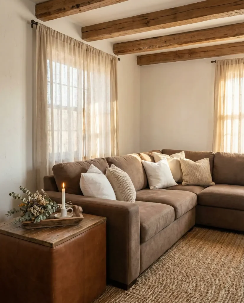 This style translates especially well in homes in the Southwest and along the West Coast, where the natural light and architecture already lean warm and organic. A grey sectional with tan accents and greenery in a sun-drenched Arizona or California home looks effortlessly put together in a way that the same combination might not achieve in a darker, more enclosed space. If you have good natural light and warm-toned walls, this is one of the easiest and most rewarding sectional looks you can create.