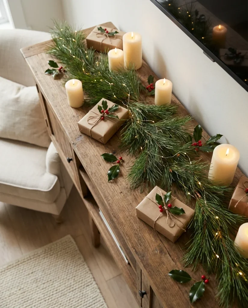 The TV console during the Christmas season deserves as much attention as the mantel—maybe more, since it’s at eye level when you’re settled on the couch. Layering evergreen garland across the surface, tucking in battery-operated fairy lights, and scattering a few matte ornaments between existing decor creates a look that’s festive without being chaotic. If your console is beneath a fireplace TV wall, the garland can cascade beautifully from console to hearth in one unified sweep.