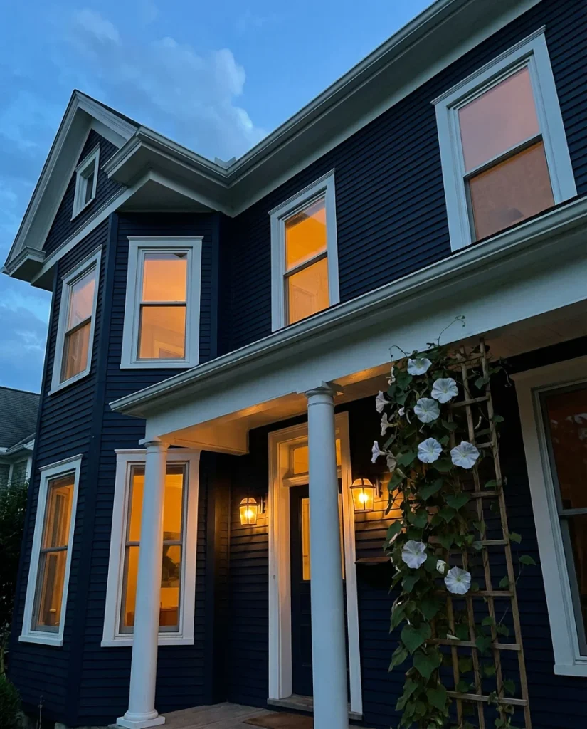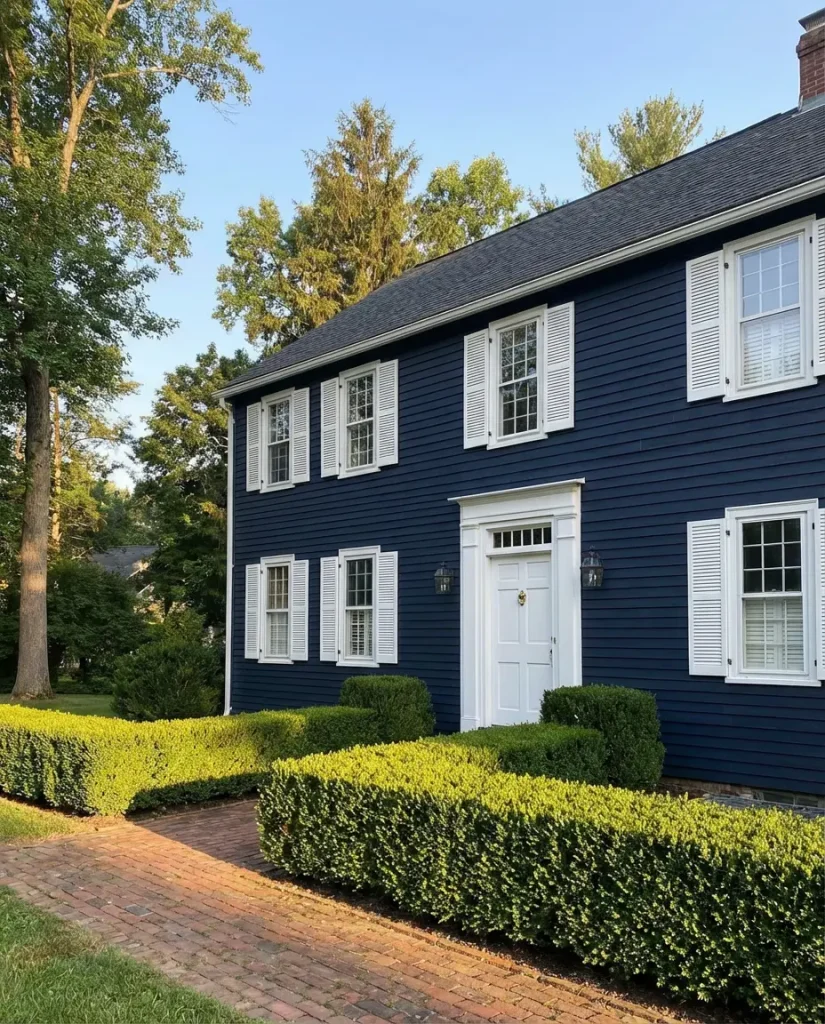 If dark exteriors are trending, navy blue is leading the charge as the most dramatic and design-forward option in the group. An inky, almost black navy on a two-story Colonial or traditional home creates a visual presence that is impossible to ignore—in the best possible way. Paired with brass or bronze hardware, white trim, and lush foundation plantings, it’s a combination that has appeared in architectural publications with increasing frequency heading into 2026.