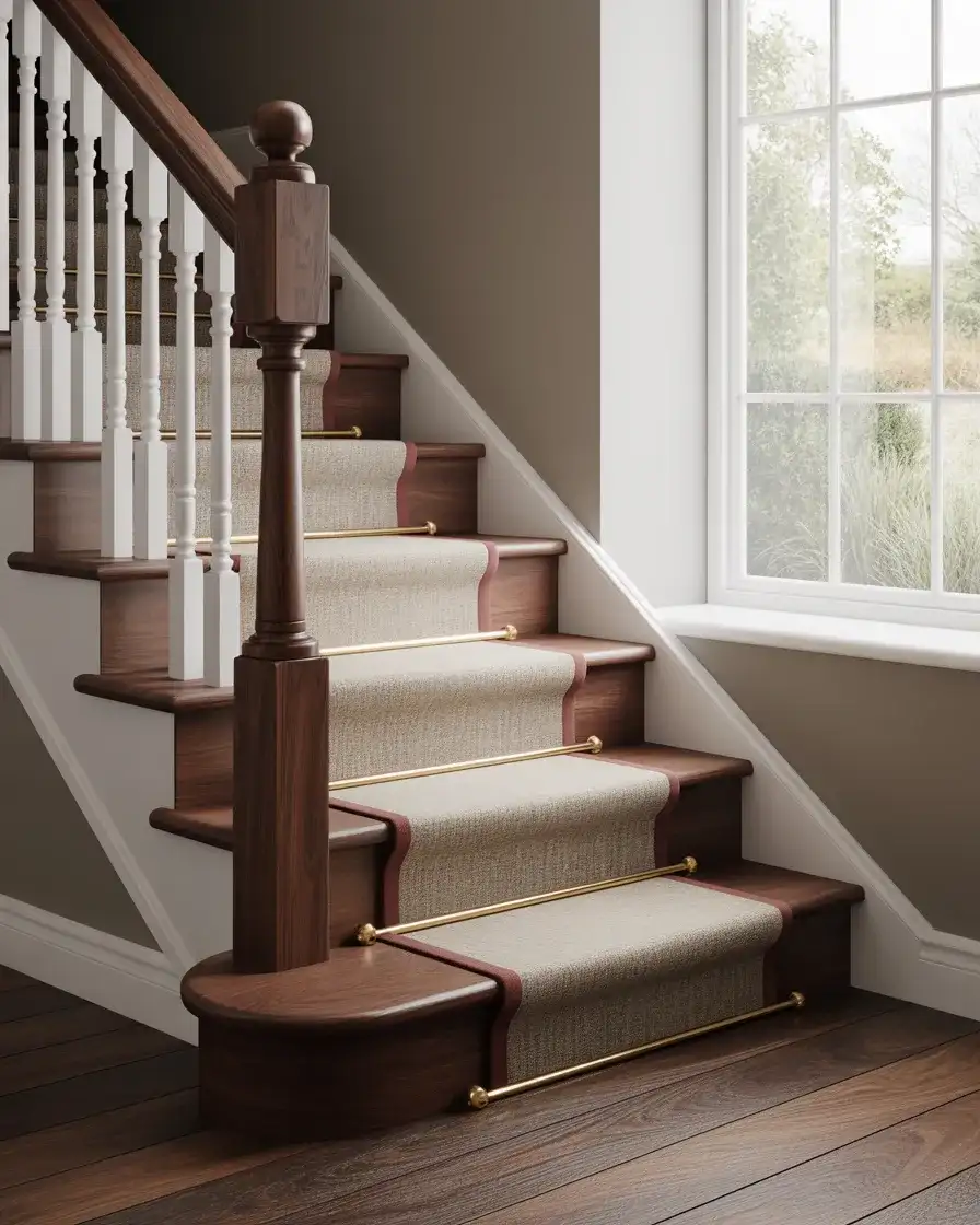 In the Midwest and Northeast, where winters are long and floors get cold, this setup is almost standard. A wool-blend runner in a neutral tone will last 10 to 15 years with regular vacuuming, and it’s easier to replace than a full carpet job. If you’re installing it yourself, use a stair tool to tuck the edges cleanly—loose corners are a tripping hazard. Budget around $600 to $1,200 for a quality runner and professional installation on a standard 13-step staircase.