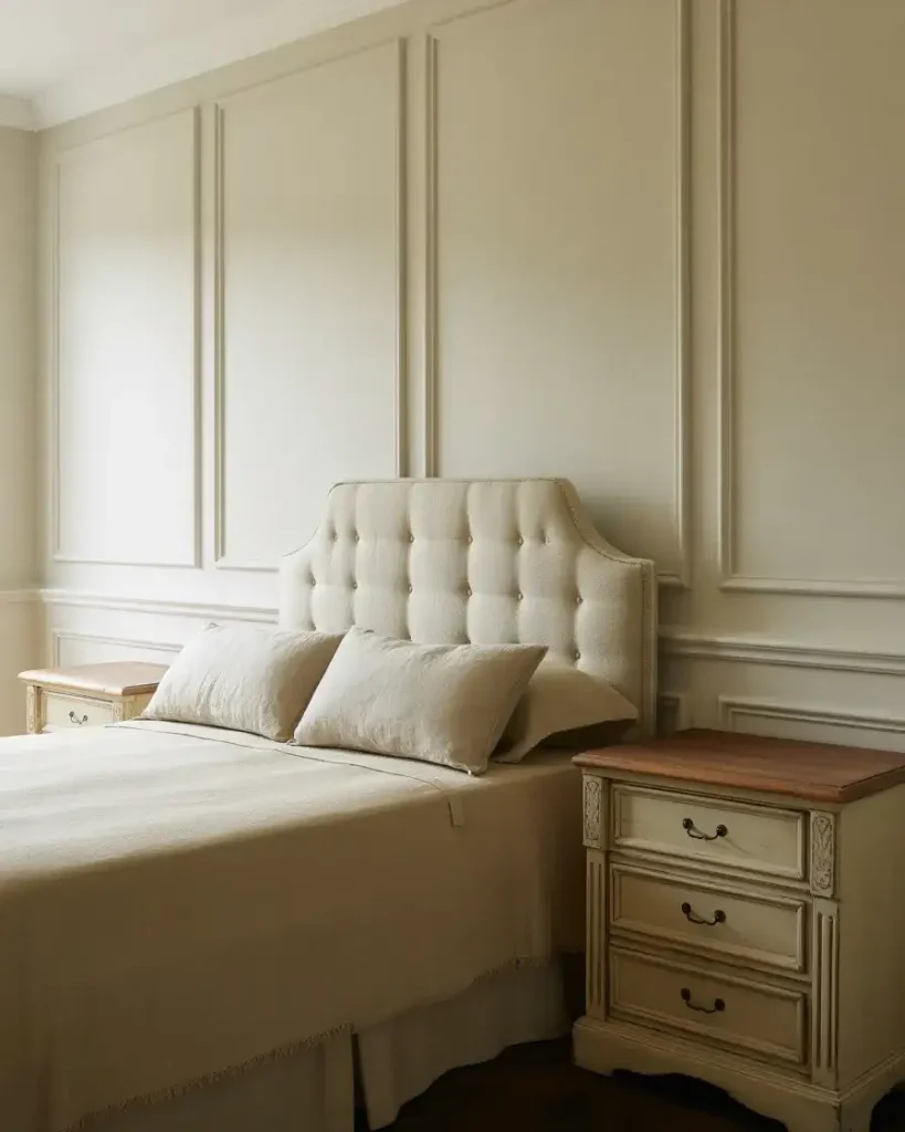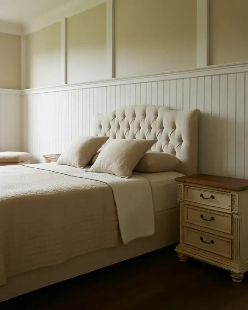 Wainscoting—the classic American wall treatment where paneling covers the lower third of a wall—is experiencing a genuine resurgence, and when paired with creamy off-white paint in two complementary tones, it creates a bedroom that feels both historically rooted and completely fresh. The upper wall in a slightly deeper cream and the wainscoting below in a clean, brighter white create a sophisticated tonal play that adds architectural interest to even a plain-box bedroom. This is a wall of ideas and color ideas combined that works beautifully in traditional, farmhouse, and transitional-style homes.
