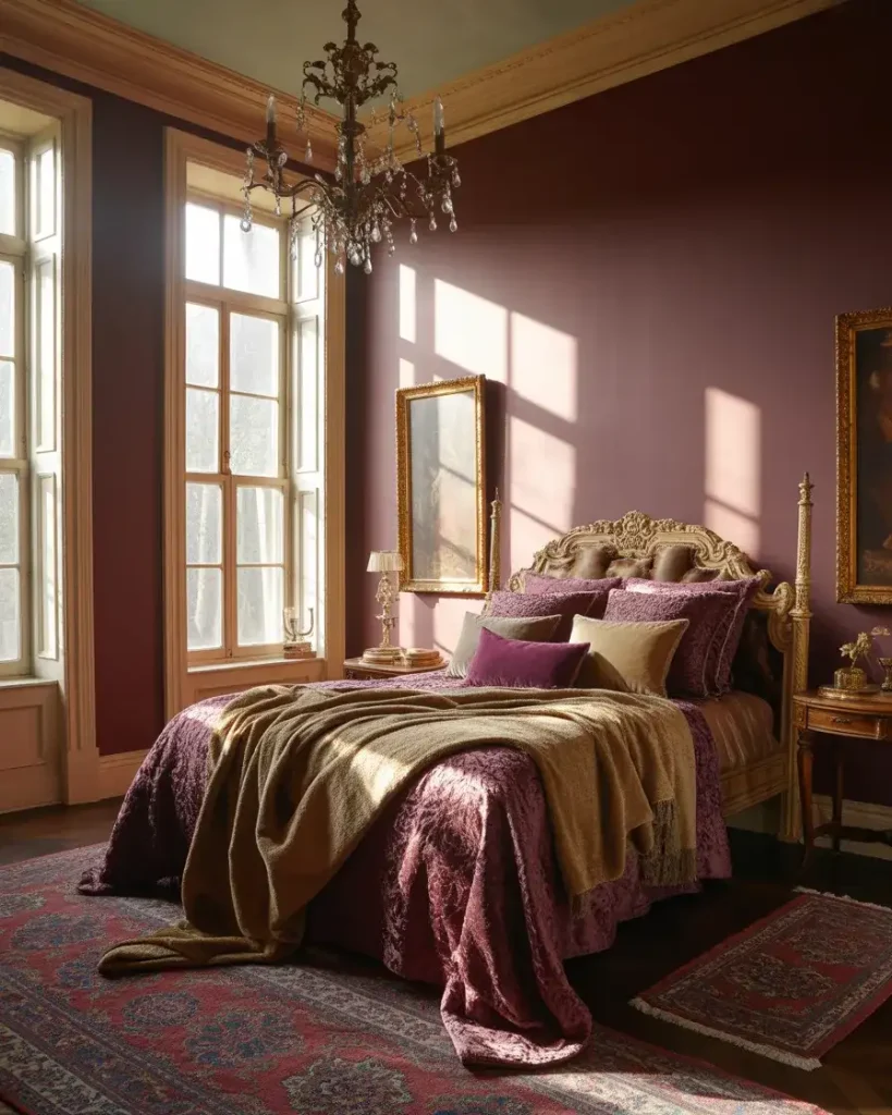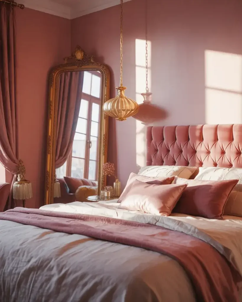 Maximalism is back—loudly and joyfully—and the dusty rose-and-gold bedroom is its most romantic expression. This is a room color ideas approach that leans into abundance: layered patterns, gilded accessories, textured wallcoverings, and a color palette that references Hollywood Regency glamour filtered through a contemporary sensibility. Dusty rose paint provides the warm, enveloping base; gold accents in mirrors, lamp bases, and hardware add the shimmer; and rich textiles in velvet, silk, and brocade tie it all together into something that feels genuinely indulgent.