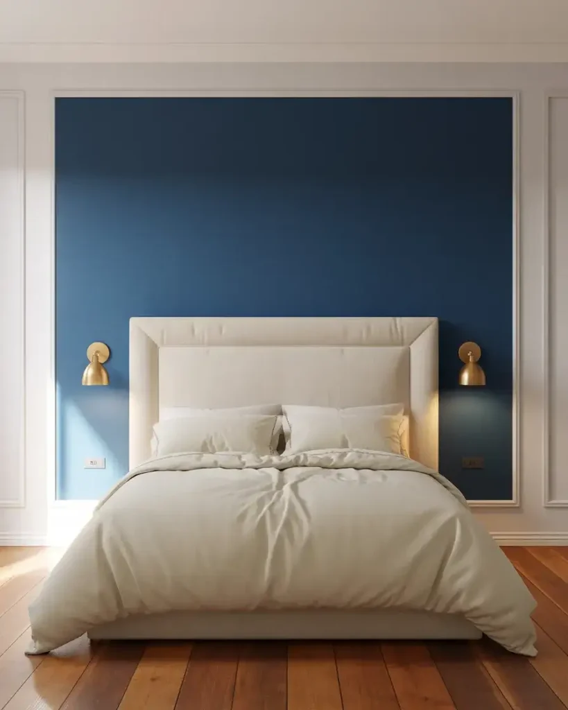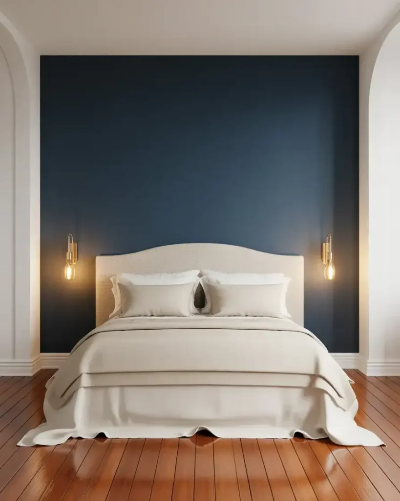One common mistake people make with dark accent walls is choosing paint that’s too cool-toned—navy with a blue-black base can feel cold and cave-like without the right lighting. To avoid this, pick a navy with warm, slightly purple undertones, like Benjamin Moore’s Hale Navy or Sherwin-Williams Naval (SW 6244). Then layer your lighting: a warm-toned bulb in your bedside lamps will turn the wall from foreboding to genuinely cozy once the sun goes down. This is a pairing that rewards careful attention to the details.