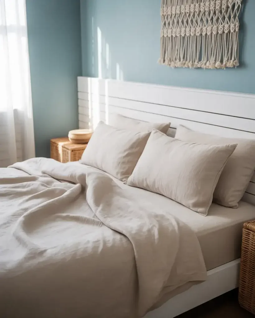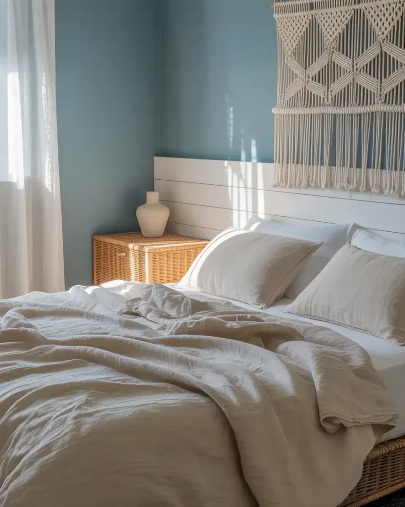 Dusty blue is the coastal palette’s most grown-up, versatile expression—sitting far from the bright nautical turquoise you’d find in a beach house gift shop and much closer to the actual color of the sky on an overcast ocean morning. It has a built-in softness and sophistication that makes it work beautifully in primary bedrooms, guest rooms, and even studio apartments where the bedroom is part of a larger living space. As a color choice, it layers naturally with warm sand, driftwood textures, and linen without feeling at all theme-y.
