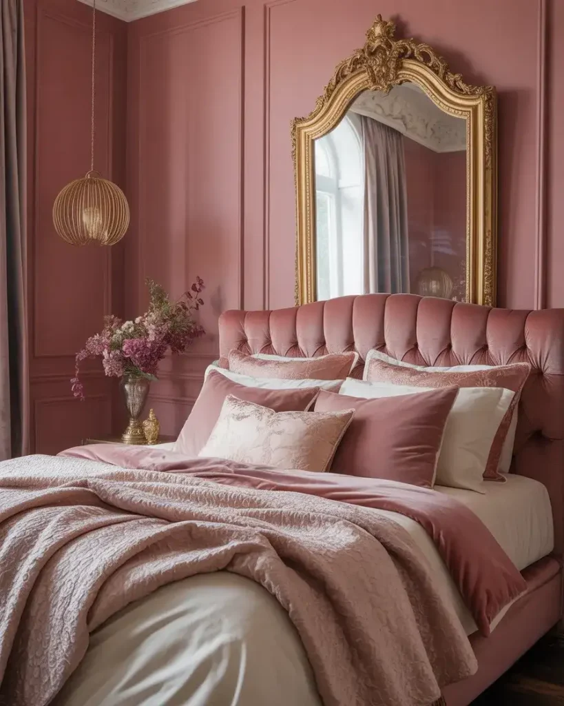 22. Dusty Rose and Gold for a Maximalist, Vintage-Glam Bedroom