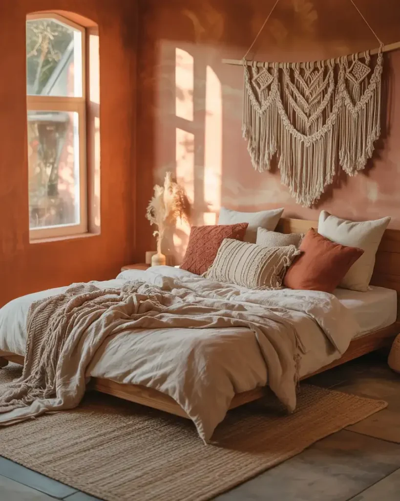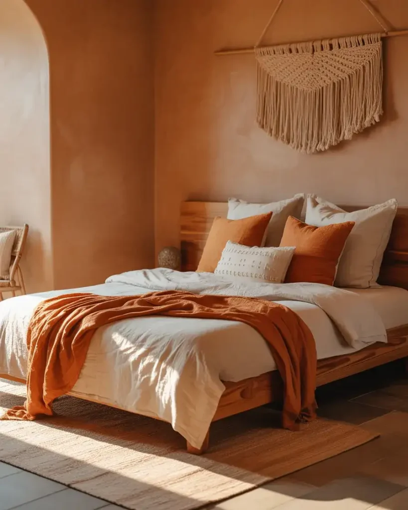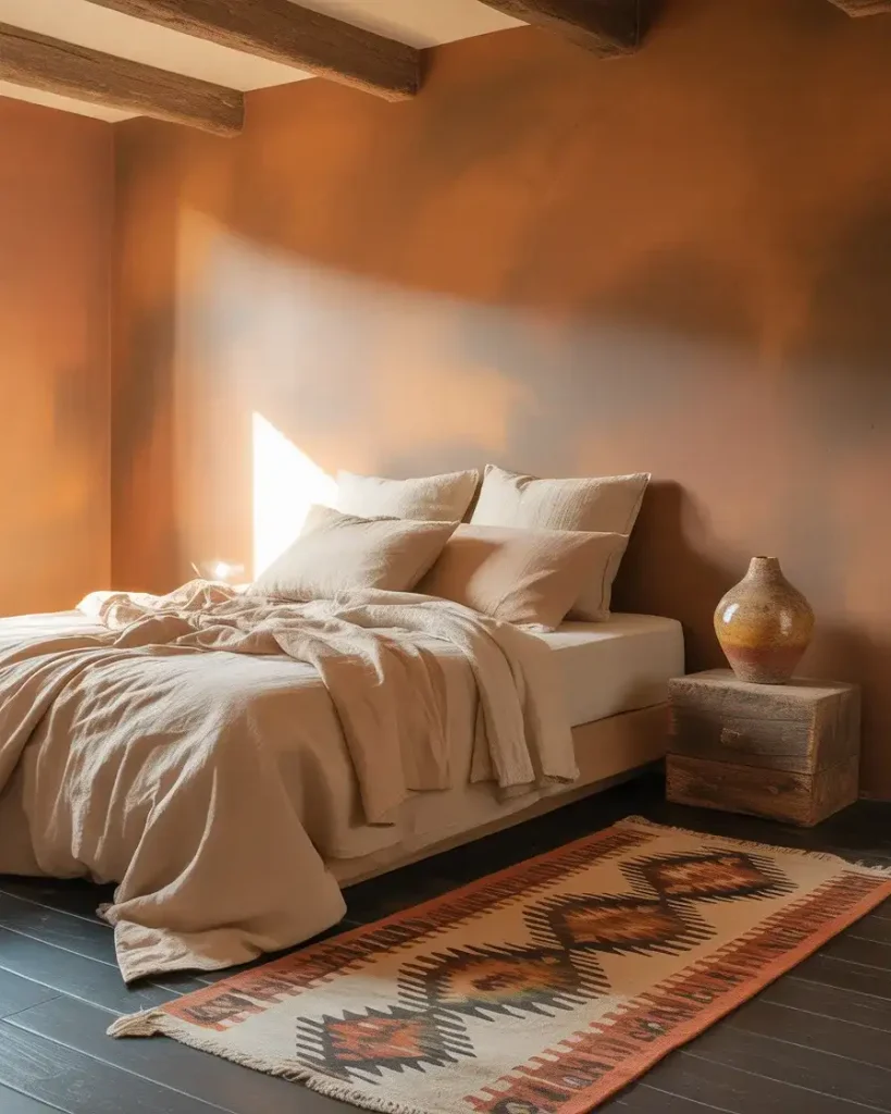 A homeowner in Tucson described terracotta as “the color that made our bedroom feel like a destination instead of just a room where we sleep”—and that captures it perfectly. The shade draws from the landscape around it: the burnt reds of canyon walls, handmade pottery, and late-afternoon desert light. For renters hesitant to commit, terracotta works just as well as an accent through bedding, a large woven wall hanging, or even a painted secondhand dresser. The spirit of the color comes through regardless of how much square footage you give it.