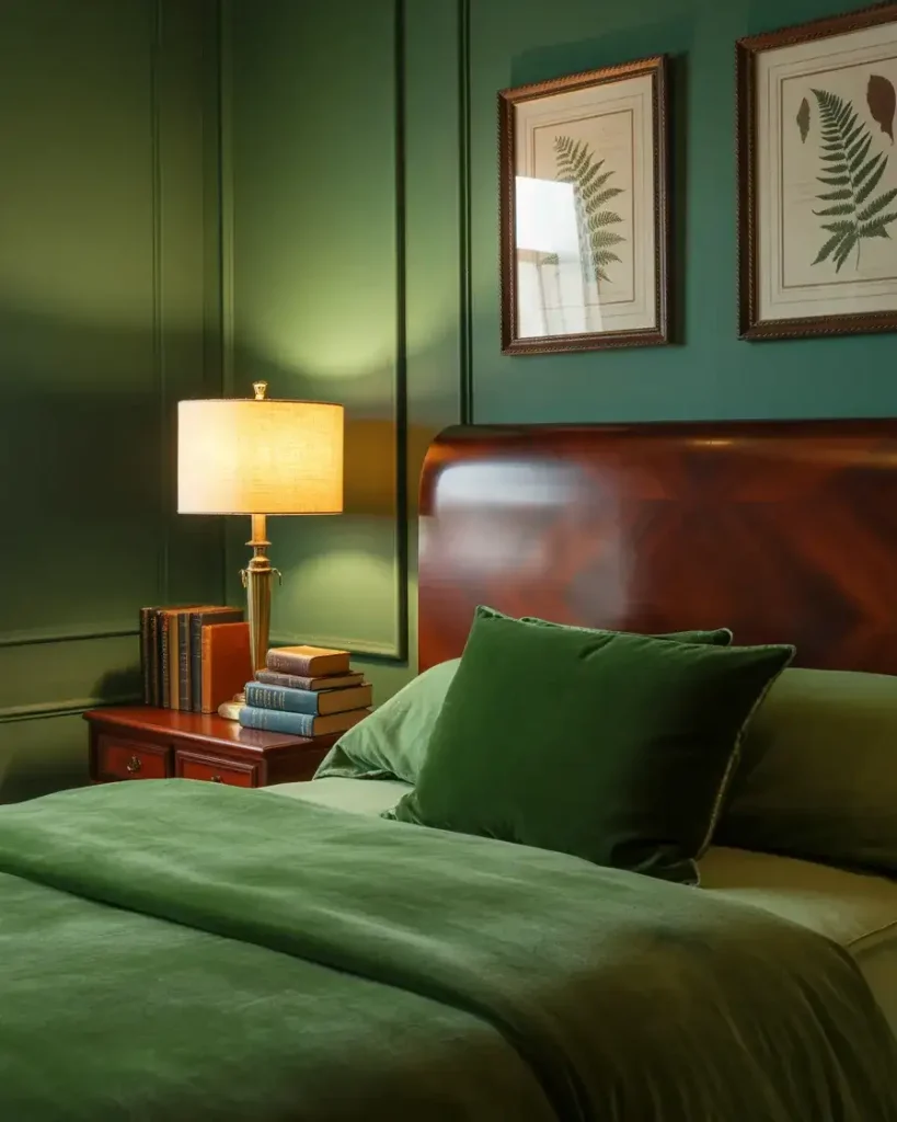Deep, enveloping forest green is the color of the well-read, the well-traveled, and the person who collects books and has opinions about lighting. In a bedroom, it creates a space that feels simultaneously alive and still—like sleeping inside a clearing in the woods. It pairs beautifully with dark stained wood, leather, and rich jewel tones in artwork and textiles. Unlike lighter greens that can feel country or casual, forest green reads as intellectual and collected—perfect for a primary bedroom that functions as a true personal sanctuary.