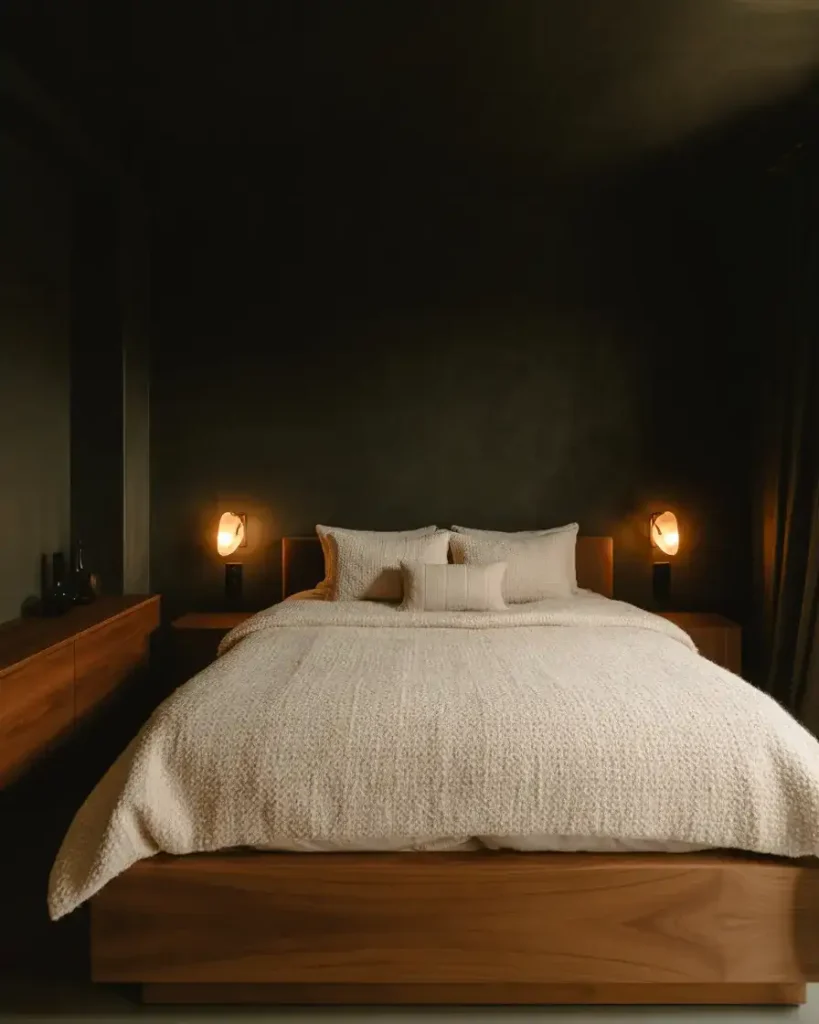There’s a reason that moody, dark bedrooms keep showing up in every “most saved” list on Pinterest—they feel like a genuine escape. Deep charcoal wall design ideas create a cocooning effect that turns a bedroom from a functional room into a sensory retreat. The key is pairing charcoal with warmth: honey-toned wood furniture, amber bulb lighting, plush velvet or bouclé textiles, and warm metallics like aged brass or copper. Without those counterpoints, charcoal can feel sterile; with them, it feels like the best hotel room you’ve ever stayed in.