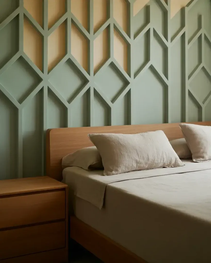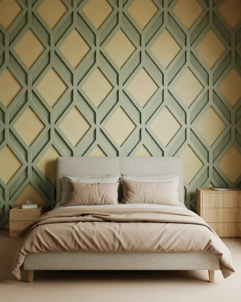 Paint doesn’t have to mean solid color—and geometric painted wall design ideas are one of the most compelling ways to add pattern, depth, and visual interest to a bedroom without hanging anything. A soft sage and warm stone geometric—whether it’s a simple half-paint technique, a series of painted triangles, or a more elaborate diamond grid—gives a wall the graphic energy of wallpaper at a fraction of the cost. As an accent wall treatment behind a bed, it creates a headboard effect that’s entirely two-dimensional but feels enormously substantial.