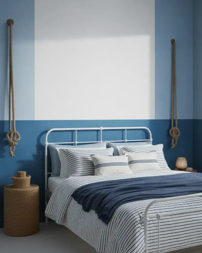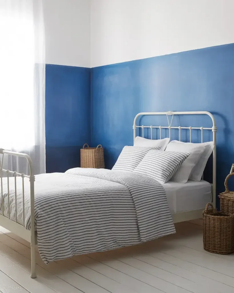 The two-tone painted bedroom—where the lower portion of the wall is painted in a deeper or contrasting shade divided by a color block or chair rail line—has become one of the most searched wall ideas of the past two years, and a blue-and-white pairing is its most classic, clean-feeling variation. Deep coastal blue on the lower third of the wall, crisp white above, separated by a simple painted or molded line: it’s a combination that reads as refreshed and considered, working equally well in a beach house guest room or a city apartment bedroom that craves a sense of openness.