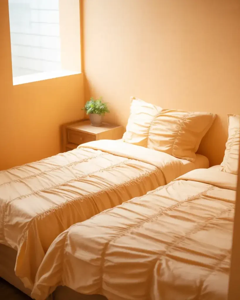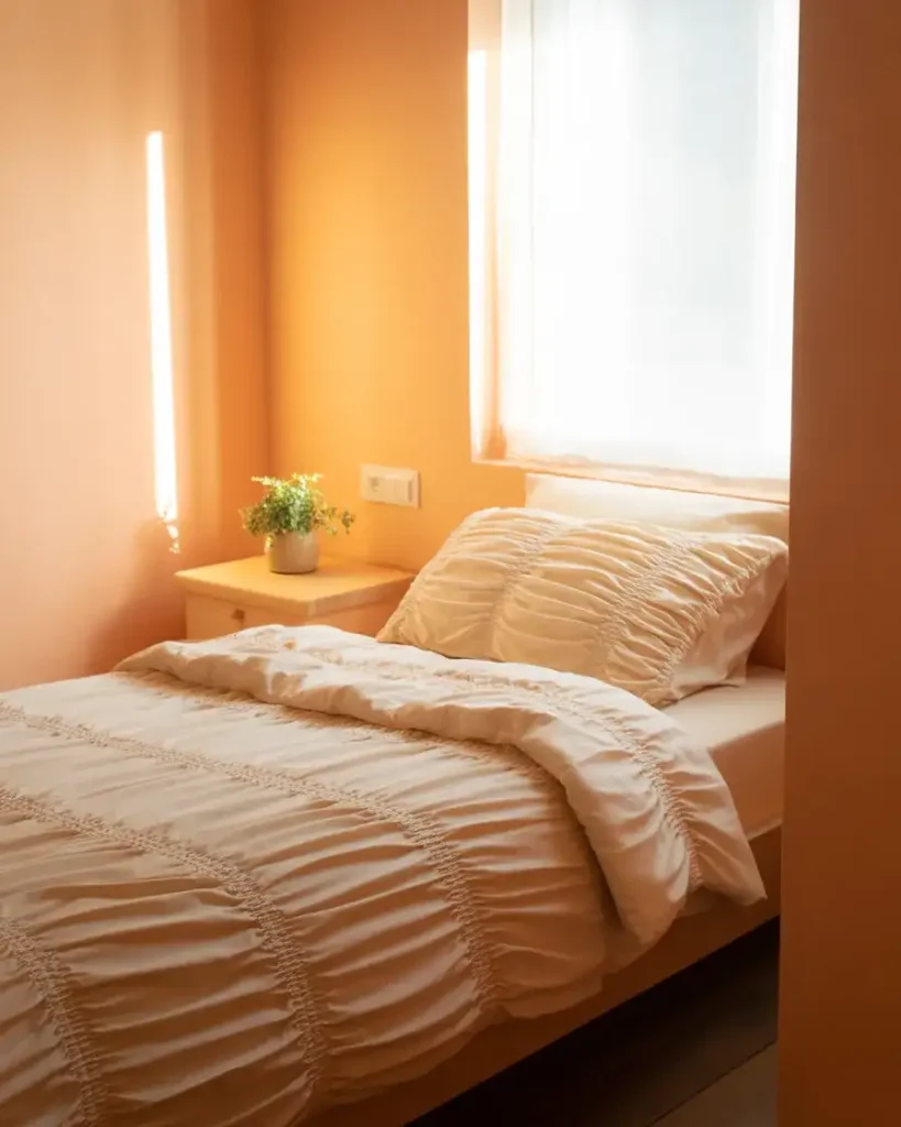 Peach is arguably the single most underestimated color in residential painting—and it’s especially powerful in ideas for small rooms because of the way warm apricot and peach tones reflect light and seem to push walls outward. Where a cool gray or stark white can make a small bedroom feel enclosed, a well-chosen warm peach creates a sense of expansion—the room feels bigger, brighter, and sunnier than its square footage suggests. It also flatters skin tones beautifully, making morning mirrors significantly more cheerful.