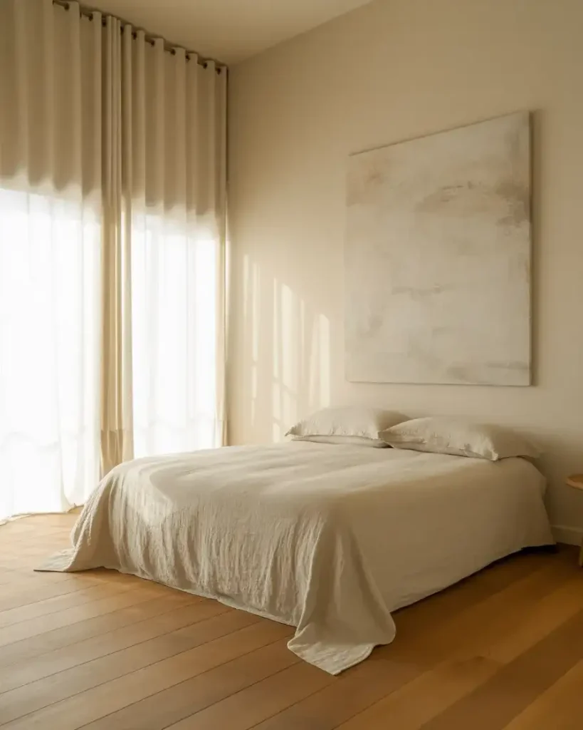Not every stunning bedroom relies on color drama. Warm white done thoughtfully—with textured canvas wall art, layered textiles, and natural material accents—can create a space that feels like a high-end retreat without a single bold choice. The difference between warm white and cold white is everything: warm whites have yellow, pink, or beige undertones that make a room feel inviting rather than clinical. Think of the difference between a luxury spa and a hospital corridor. Both are white—but only one makes you exhale when you walk in.