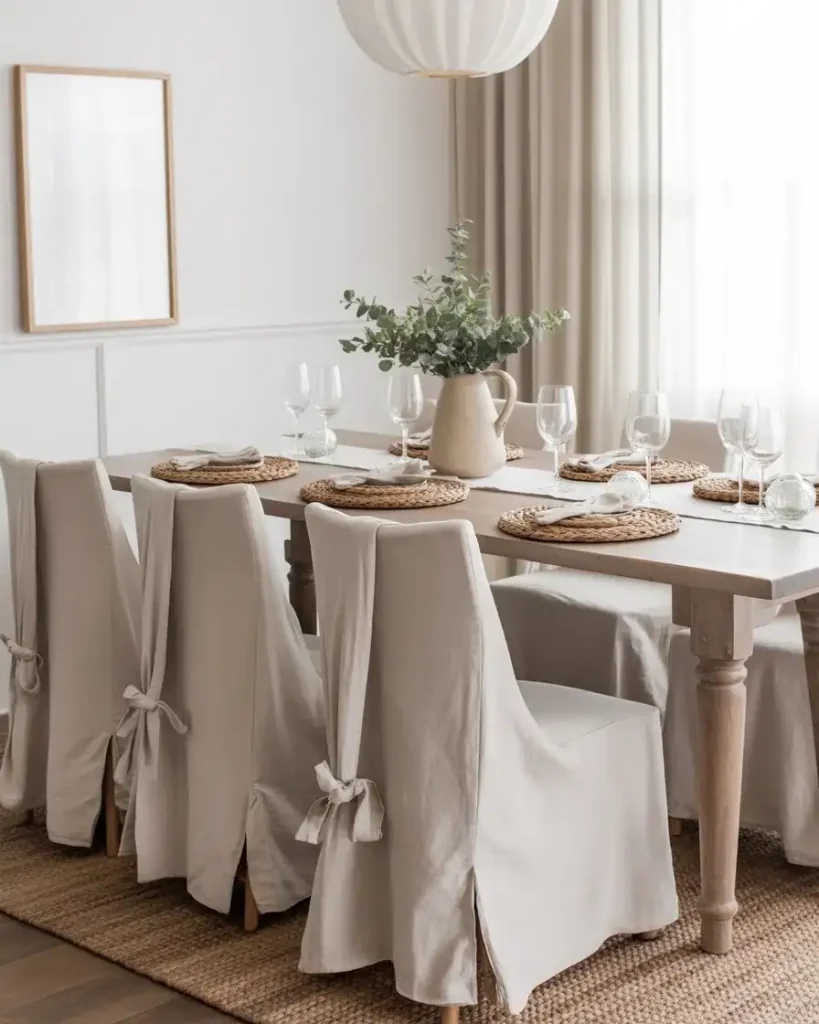 Dining chair covers offer an affordable way to refresh your space without buying new furniture. Whether you’re protecting existing upholstery or completely changing the look for different seasons or occasions, slipcovers provide flexibility that permanent upholstery can’t match. Choose crisp white linen for summer elegance, cozy textured fabrics for fall and winter, or festive patterns for holidays. The best covers fit snugly without bunching, are machine-washable for easy care, and can transform your dining area in minutes.