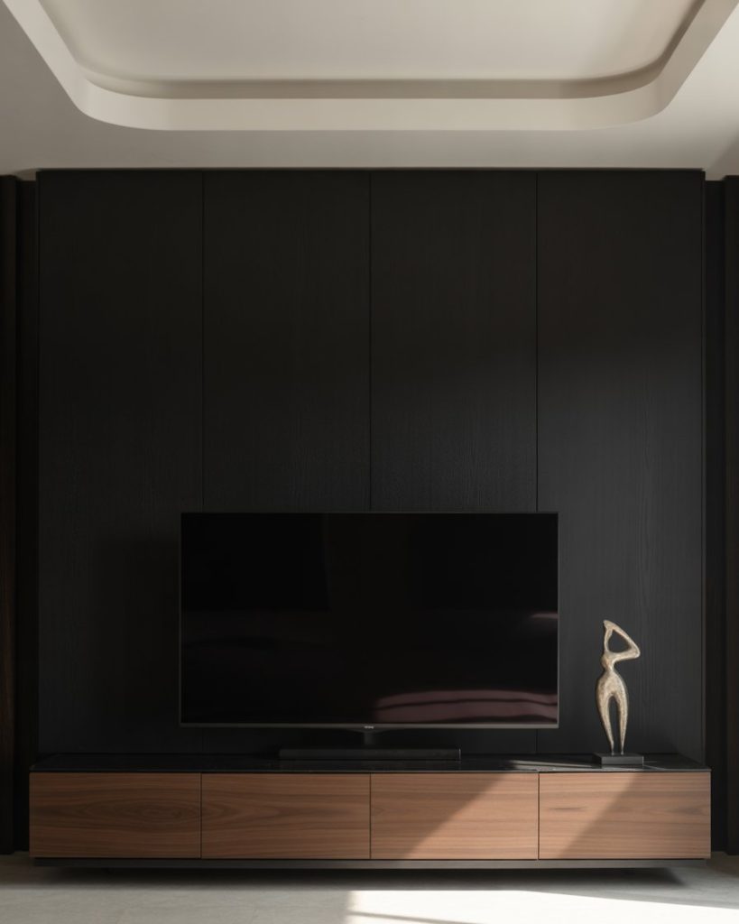 A black matte accent wall behind your Tv creates a cinematic backdrop to impart even more depth and focus. It creates a beautiful finish to absorb glare, allowing the screens to stand out. The gorgeous feature of a modern accent wall in living room layouts is boldly set in contrast, ideal for those high ceiling or vaulted ceilings spaces where clean lines define all elegance.