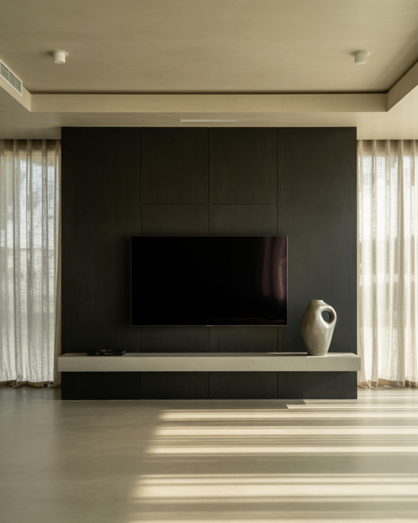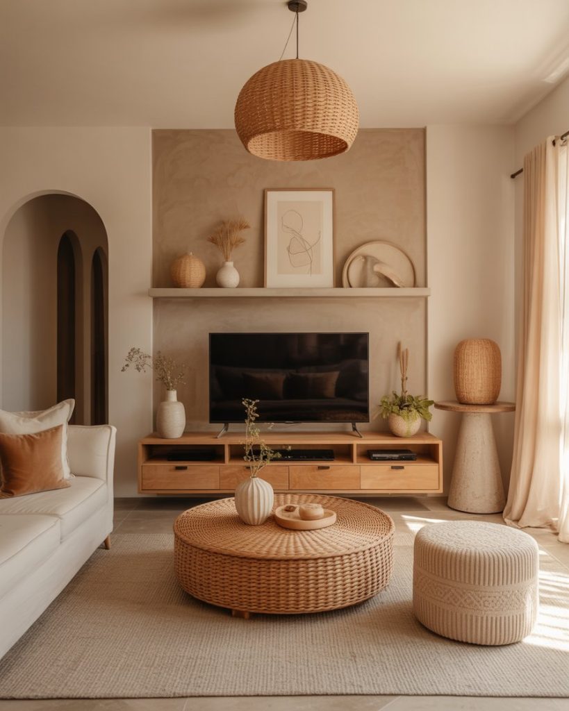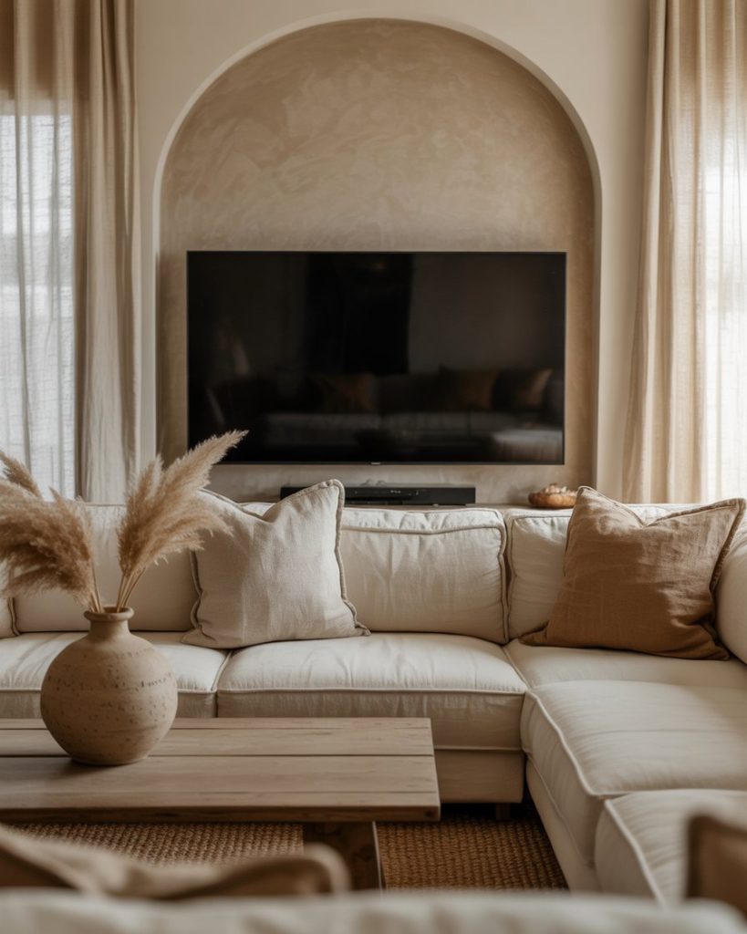 Textured plaster finishes are timeless, offering subtle depth through their hand-applied texture. A painted beige or sand tone behind the Tv exudes calm. Combine with wood details and stone decor for a natural spa-like living room.