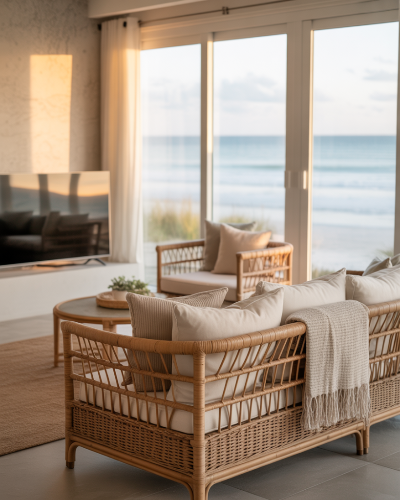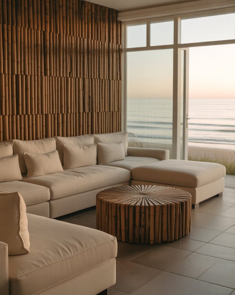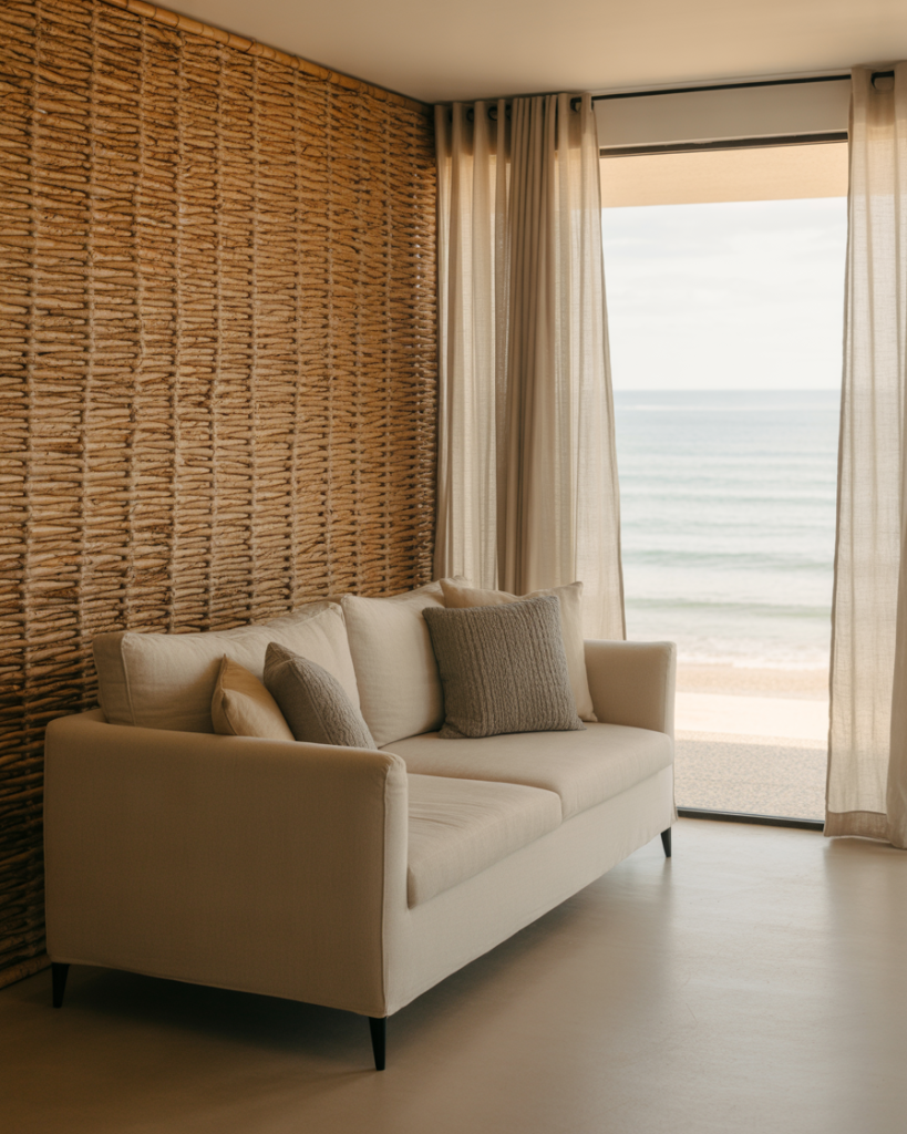 For an eco-conscious homeowner, the bamboo panelling presents an elegant solution. The vertical rhythm and textured warmth are an excellent fit for coastal or modern accent wall styles. Partner with linen, cotton, and soft wood tones for a light, airy aesthetic.